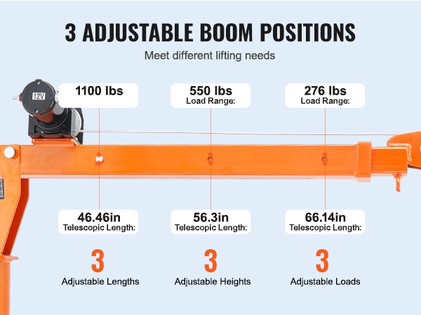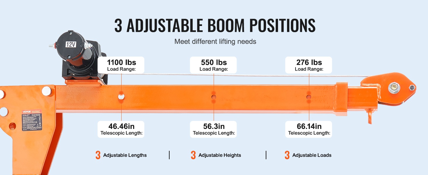 Nosturissa on kolme säädettävää asetusta, joiden avulla voit valita sopivan ulottuvuuden ja korkeuden erilaisille taakkoille. Voit tuoda nosturin lähemmäs, nostaa korkeammalle tai säätää kulmaa tilanteen mukaan.