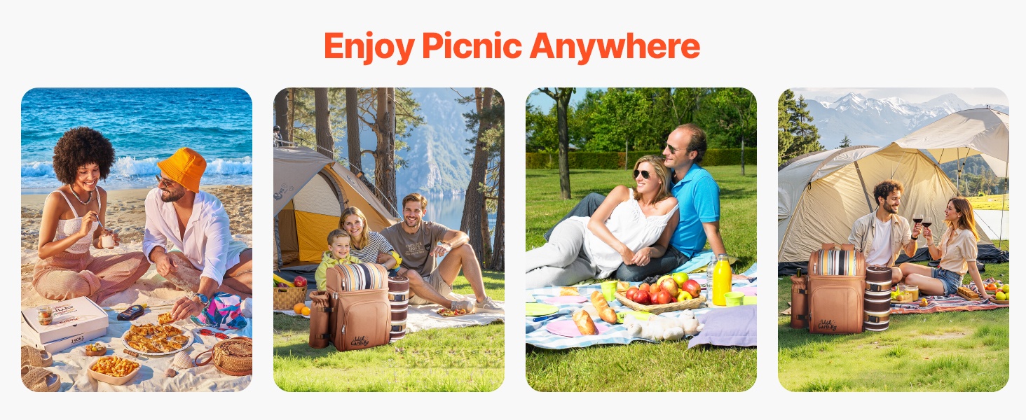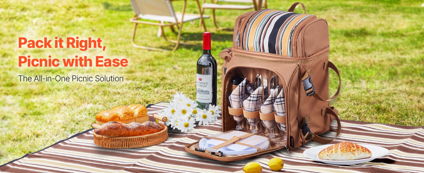 Tämä käytännöllinen piknikreppu pitää ruoat, juomat ja astiat siististi järjestyksessä retkiä, rannalle menoa tai leirintää varten. Mukana tulevien varusteiden ansiosta neljän hengen piknikin valmistelu on vaivatonta.
