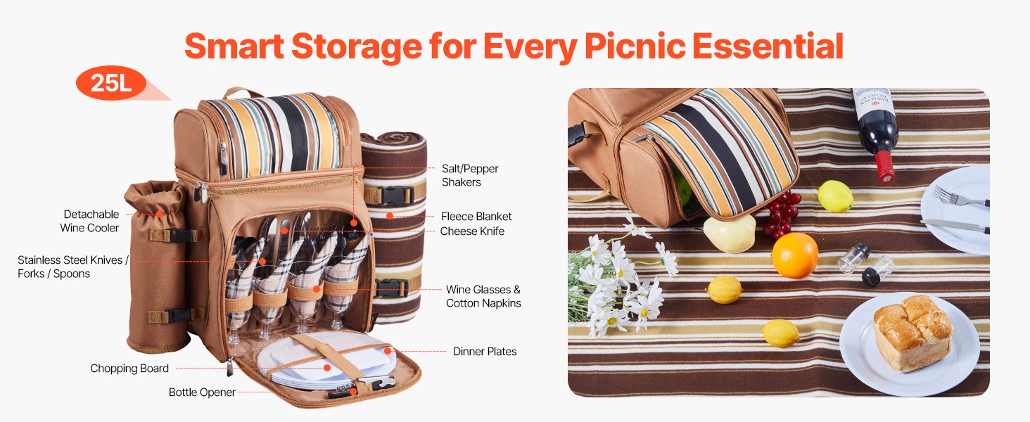 Piknikrepun lokeroissa ruoat, juomat ja ruokailuvälineet pysyvät omilla paikoillaan. Olit sitten perheen kanssa puistossa tai ystävien kanssa retkellä, kaikki tarvittava kulkee siististi samassa laukussa.