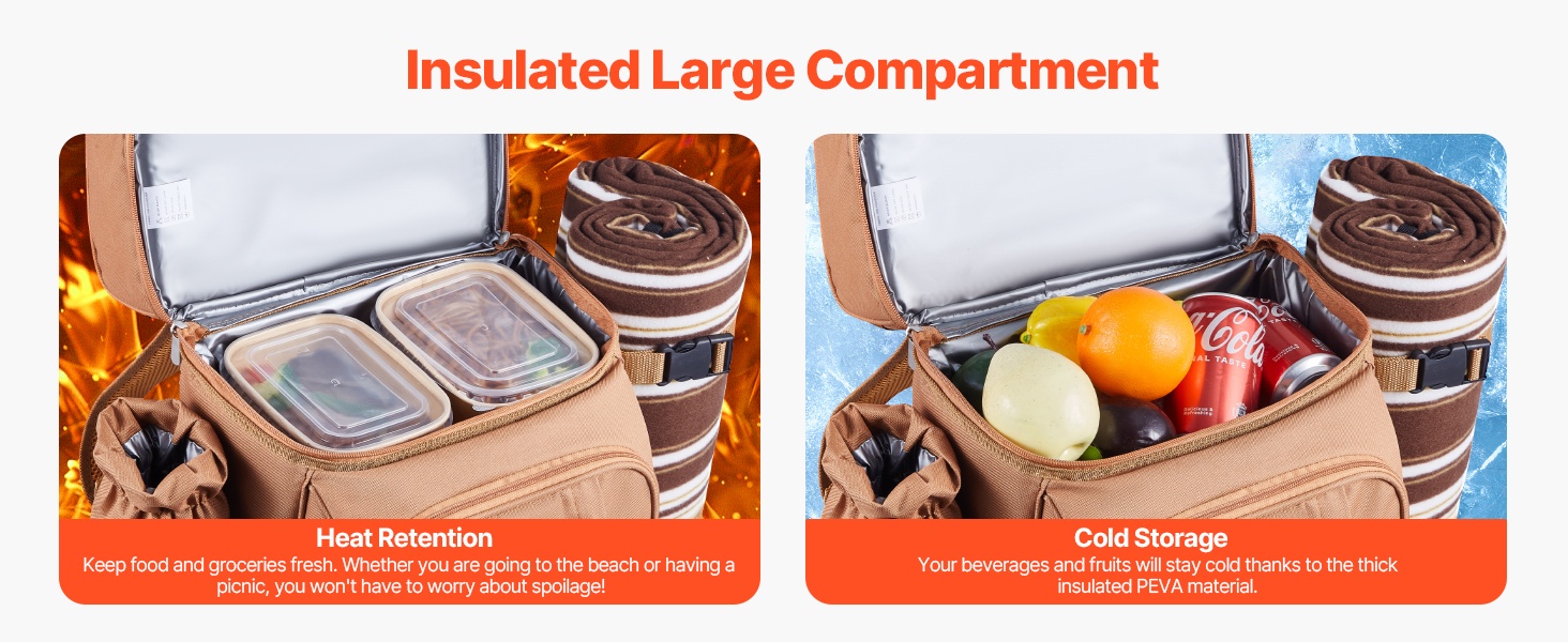 Suuressa eristetyssä osastossa kylmät juomat ja tuoreet eväät pysyvät viileinä useiden tuntien ajan. Eristys auttaa säilyttämään sopivan lämpötilan, jotta voit nauttia ruoasta ja juomasta ulkona juuri sellaisina kuin haluat.