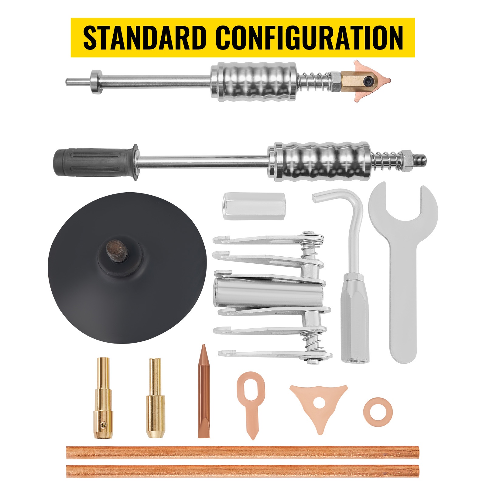 Toimitukseen sisältyy kattava valikoima vetotappeja, aaltolankoja, hiilikärkiä ja muita lisävarusteita erilaisten kolhujen oikaisuun. Kompakti työkalupakki helpottaa säilytystä ja tarvikkeiden järjestyksessä pitämistä.