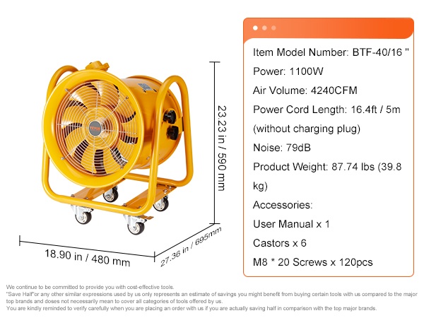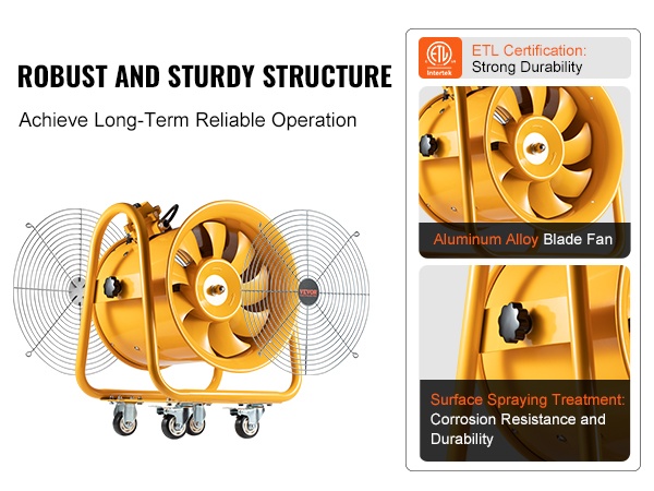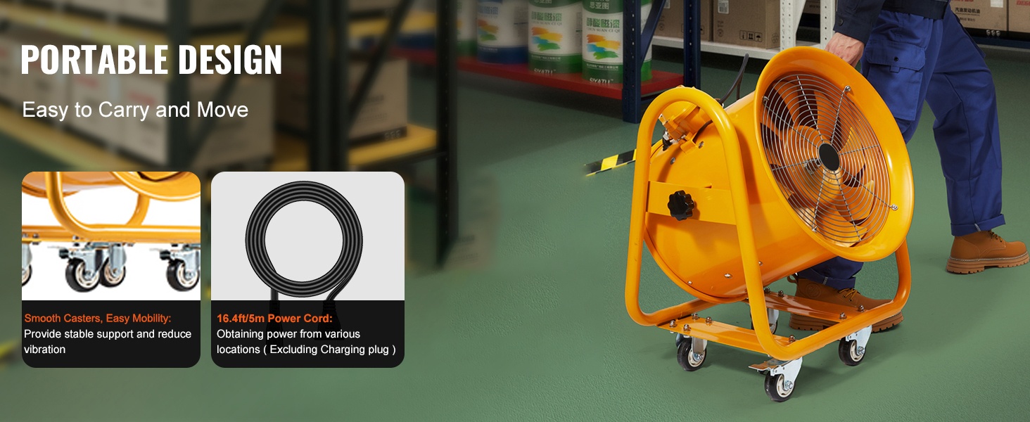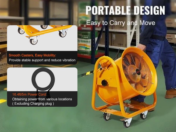 Tämä kannettava teollisuuspuhallin poistaa tehokkaasti savua, pölyä, hajuja ja kuumaa ilmaa työtiloista. Se sopii esimerkiksi varastoihin, rakennustyömaille ja teollisiin tiloihin, joissa tarvitaan nopeaa ilmanvaihtoa ja epäpuhtauksien poistoa.