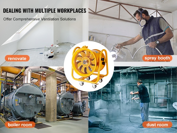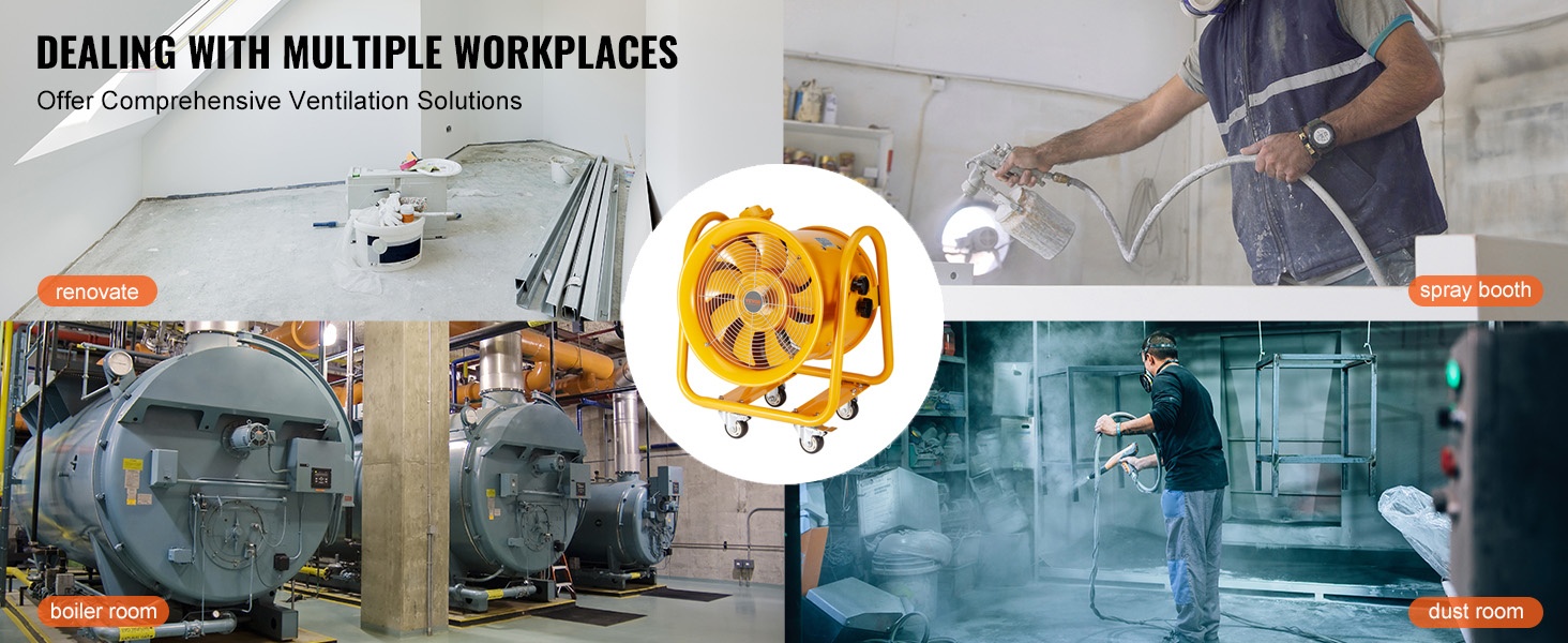 Puhallin soveltuu muun muassa varastoihin, rakennustyömaille, työpajoihin ja tehtaisiin, joissa tarvitaan tehokasta tilapäistä tai lisäpoistoa savulle, pölylle ja muille epäpuhtauksille.