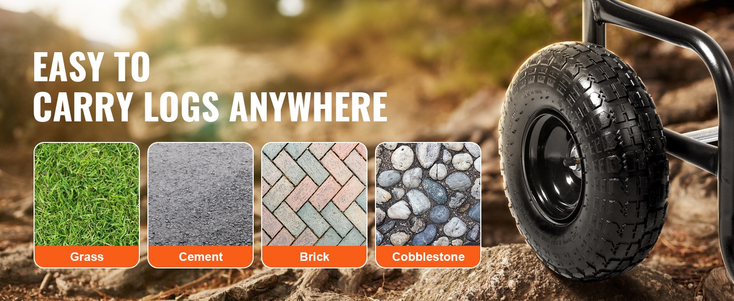 10.5"/266.7 mm ilmakumipyörät on suunniteltu selviytymään vaihtelevista maastoista. Vaunua voi käyttää polttopuiden lisäksi myös muun kuorman siirtämiseen pihalla tai varastossa.