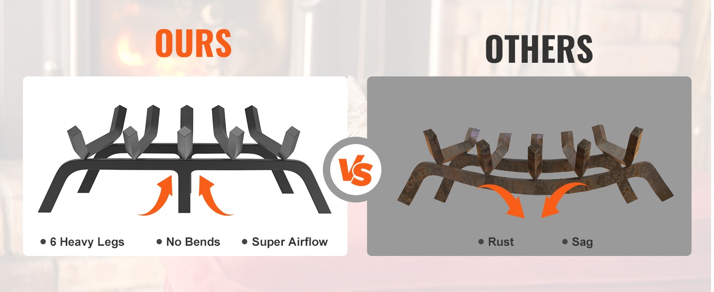 Korkealle nostettu rakenne, jota tukevat 6 teräsjalkaa, mahdollistaa tehokkaan ilmankierron puiden alla. Parempi ilmankierto helpottaa sytyttämistä, vähentää savun muodostumista ja parantaa lämmön tuottoa huonetilaan.