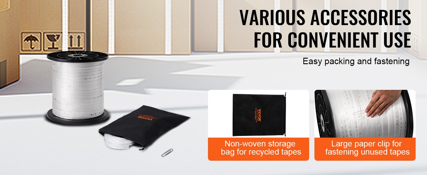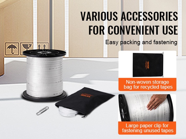 Pakkaukseen sisältyy kuitukangaspussi käytetyn nauhan säilyttämiseen sekä suuri paperiliitintyyppinen kiinnitin, jolla käyttämätön nauhan osa pysyy siististi paikoillaan. Näiden avulla nauha on helposti saatavilla ja työympäristö pysyy järjestyksessä.