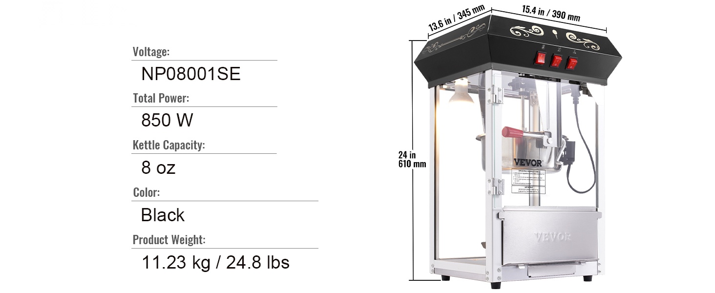 - Tehokas 850W kone, joka valmistaa jopa 48 kuppia popcornia per erä