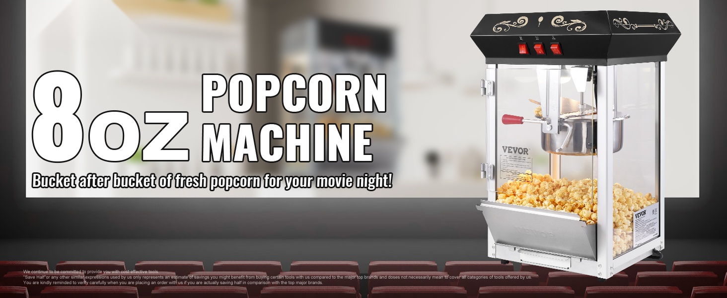 8 Oz popcorn-kattila ja sisäiset LED-valot luovat elokuvateatterimaisen fiiliksen. Kirkas valaistus antaa selkeän näkymän valmistukseen ja tekee popcorn-koneesta tilan katseenvangitsijan.