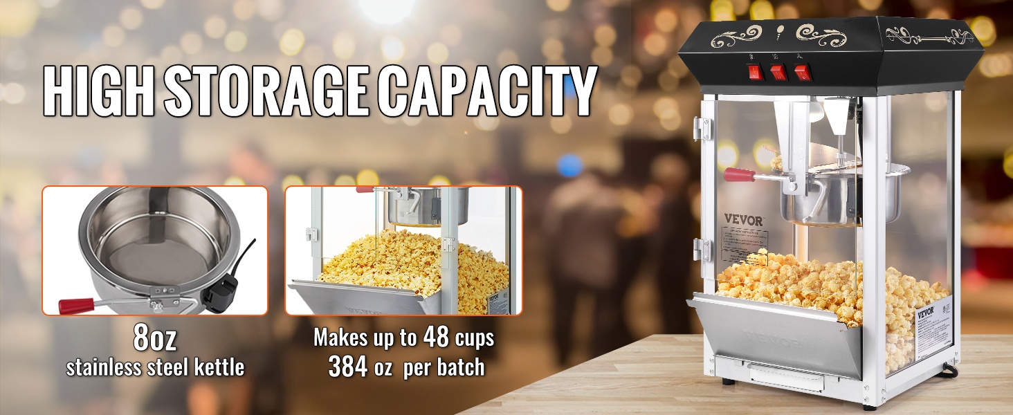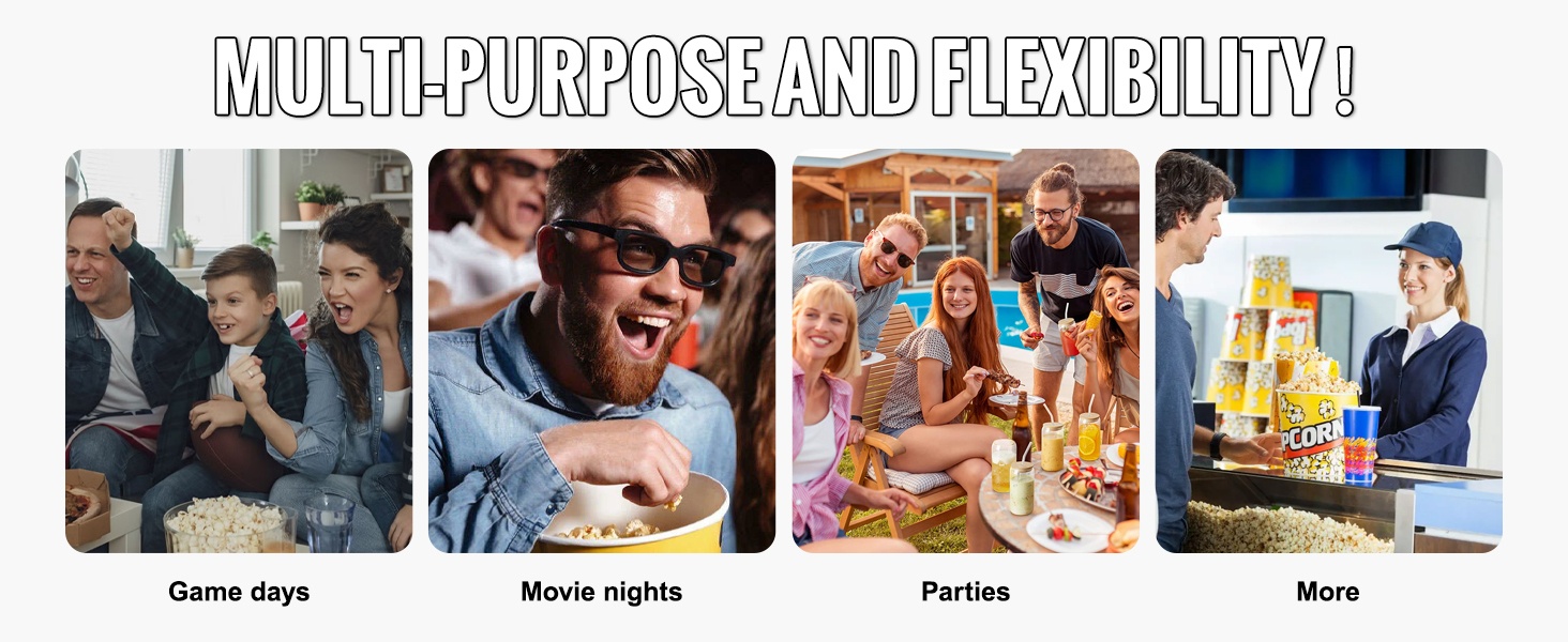 Suuren kapasiteetin popcorn-kone soveltuu hyvin tilanteisiin, joissa tarjoillaan useammalle henkilölle. Kestävä rakenne mahdollistaa erä toisensa jälkeen tuoreen popcornin valmistuksen erilaisiin tilaisuuksiin.