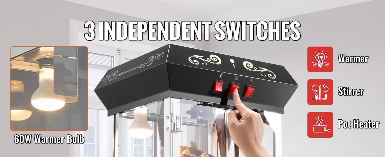 - Sisäiset LED-valot ja 60W lämpövalo korostavat popcornia ja helpottavat seurantaa