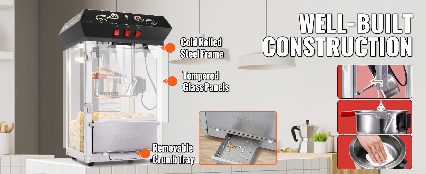 Popcorn-koneen kärry ja runko on valmistettu kylmävalssatusta teräslevystä ja karkaistuista lasipaneeleista. Kaikki elintarvikekosketuksessa olevat osat ovat ruostumatonta terästä. Siipimutteri mahdollistaa kannen helpon irrotuksen perusteellista puhdistusta varten, mikä helpottaa huoltoa ja pidentää laitteen käyttöikää.