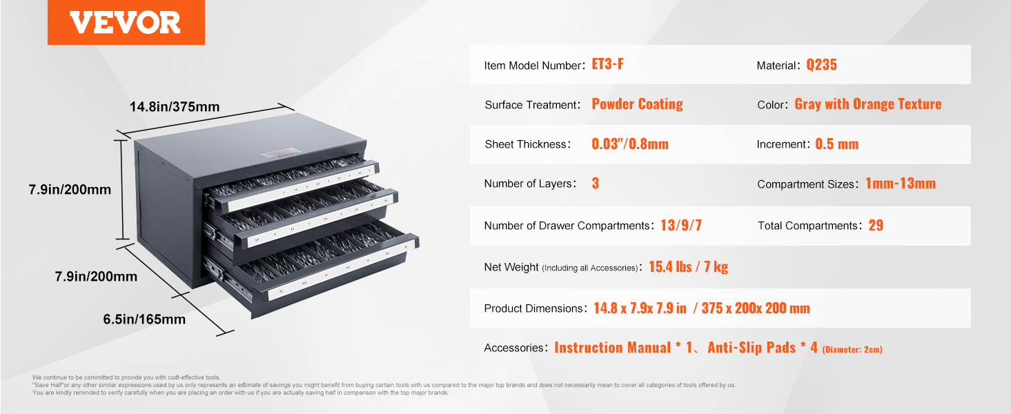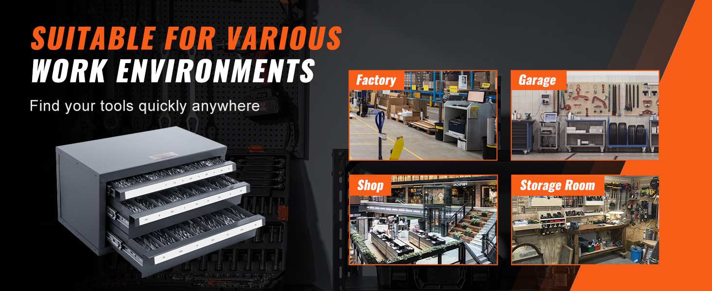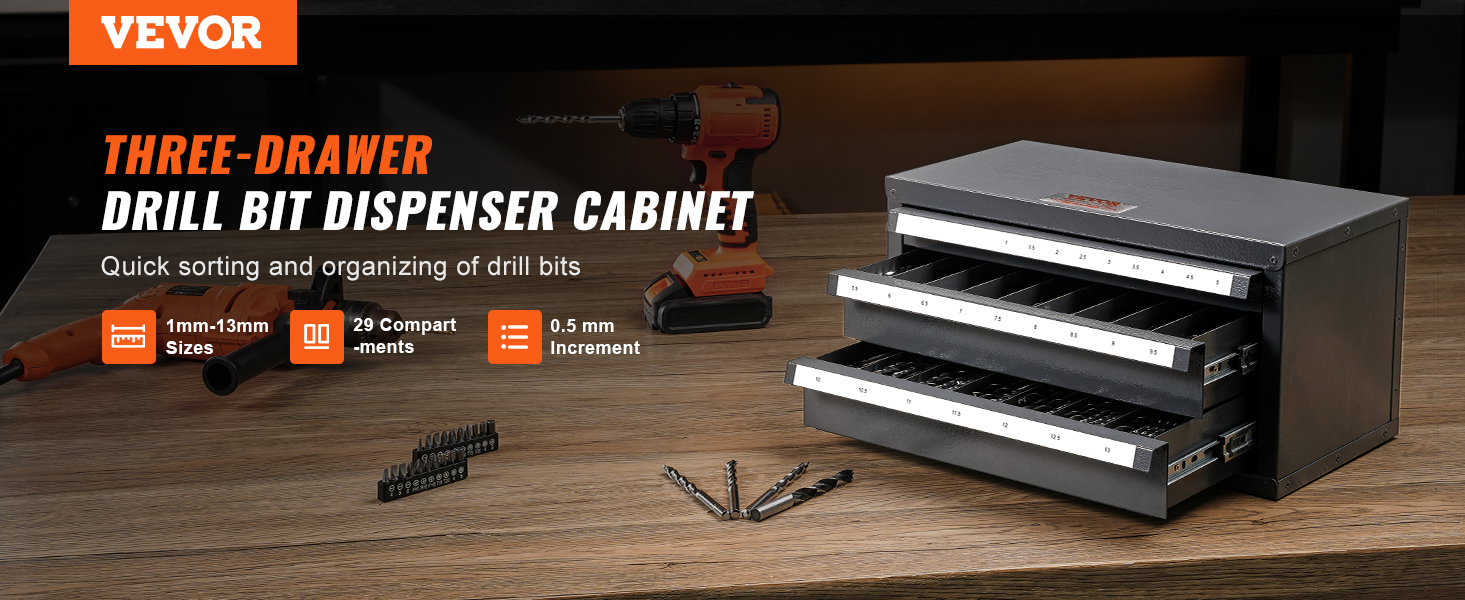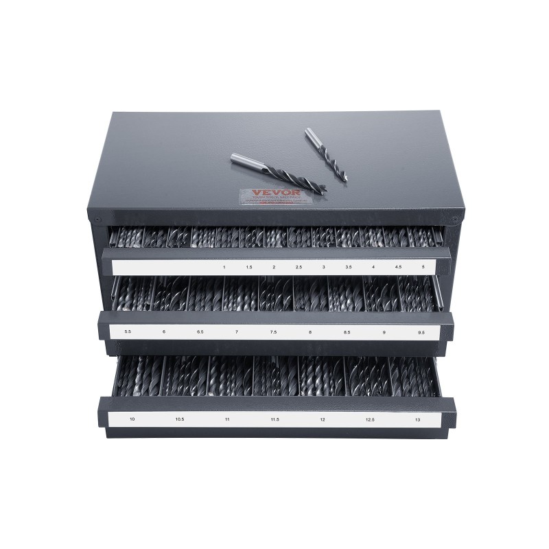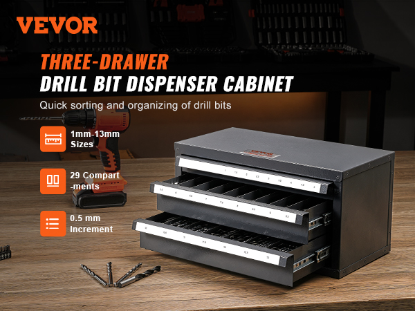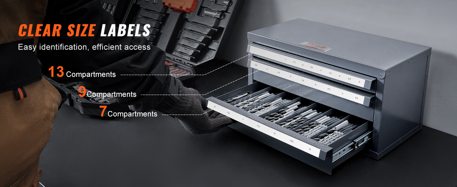 Tässä poranteräkaapissa on kolme tilavaa vetolaatikkoa, joissa on yhteensä 29 lokeroa poranterille koossa 1mm–13mm. Jokainen lokero voi säilyttää yhden poranterän tai muita pieniä tarvikkeita. Lokerot antavat selkeän paikan eri kokoisille ja tyyppisille terille.
