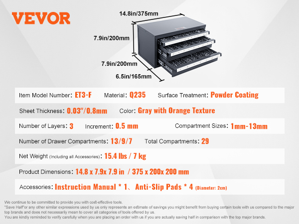 Poranteräkaappi 3 laatikkoa 29 lokeroa 1–13 mm teräksinen pinottava harmaa ET3-F