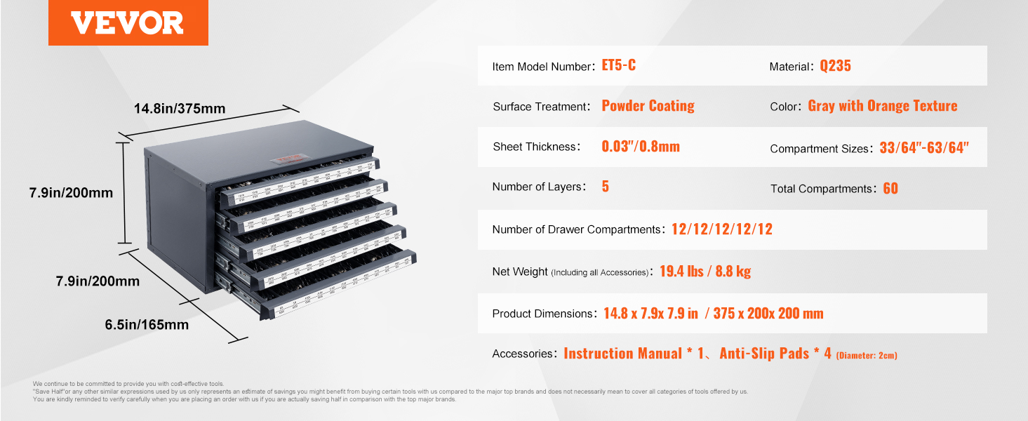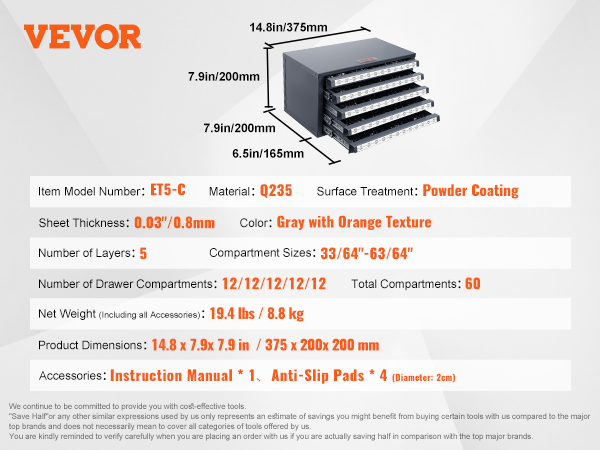Poranteräkaappi 5 laatikkoa 60 lokeroa 13.1–25.4 mm teräksinen pinoettava järjestelijä harmaa/oranssi ET5-C