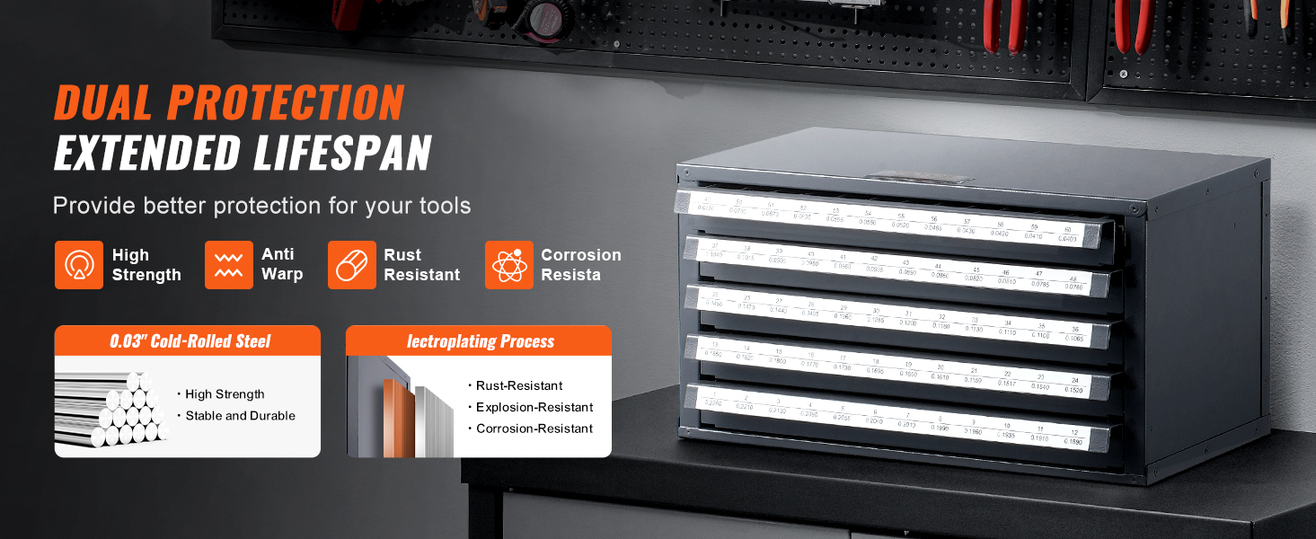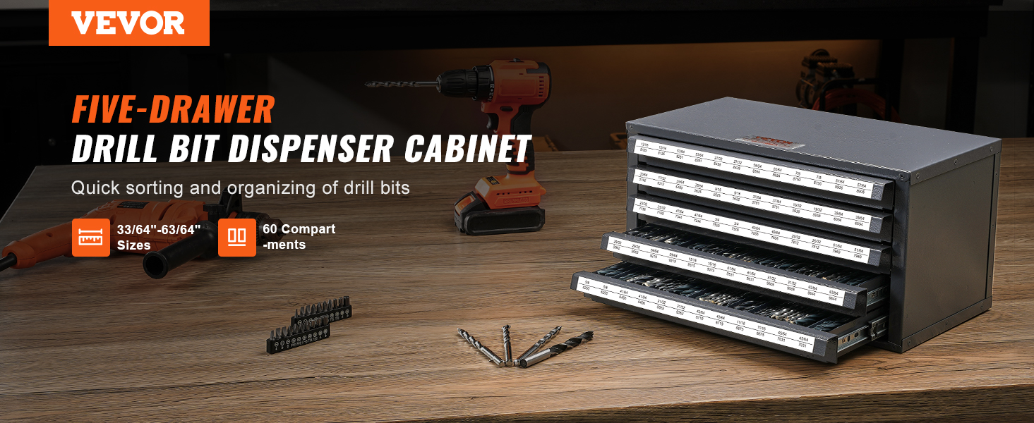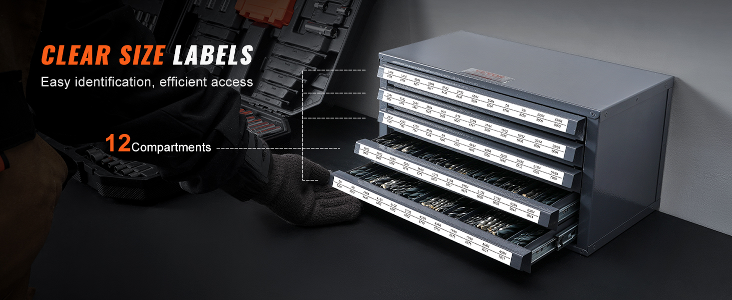Tämä poranterien säilytyskaappi tarjoaa viisi tilavaa laatikkoa ja yhteensä 60 lokeroa poranterille välillä 33/64"–63/64". Jokaisessa lokerossa on tilaa yhdelle poranterälle tai pienille lisävarusteille, ja selkeät paikat eri kokoisille ja tyyppisille terille auttavat pitämään työkalut järjestyksessä.