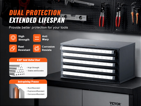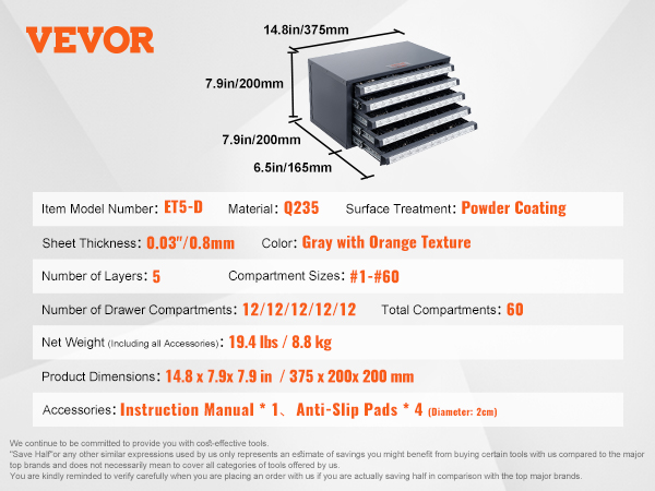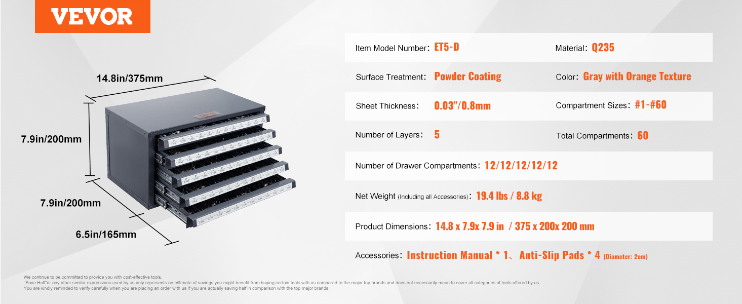 Poranteräkaappi 5 laatikkoa 60 lokeroa 1–60 harmaa/oranssi teräs ET5-D