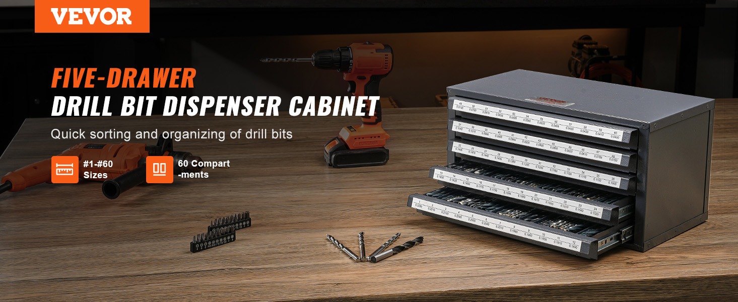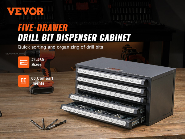 Tässä poranterien säilytyskaapissa on viisi tilavaa laatikkoa, joissa on yhteensä 60 lokeroa poranterille koossa #1–#60. Jokainen lokero on tarkoitettu yhdelle poranterälle tai pienille tarvikkeille, joten eri koot ja tyypit on helppo pitää selkeästi omilla paikoillaan.