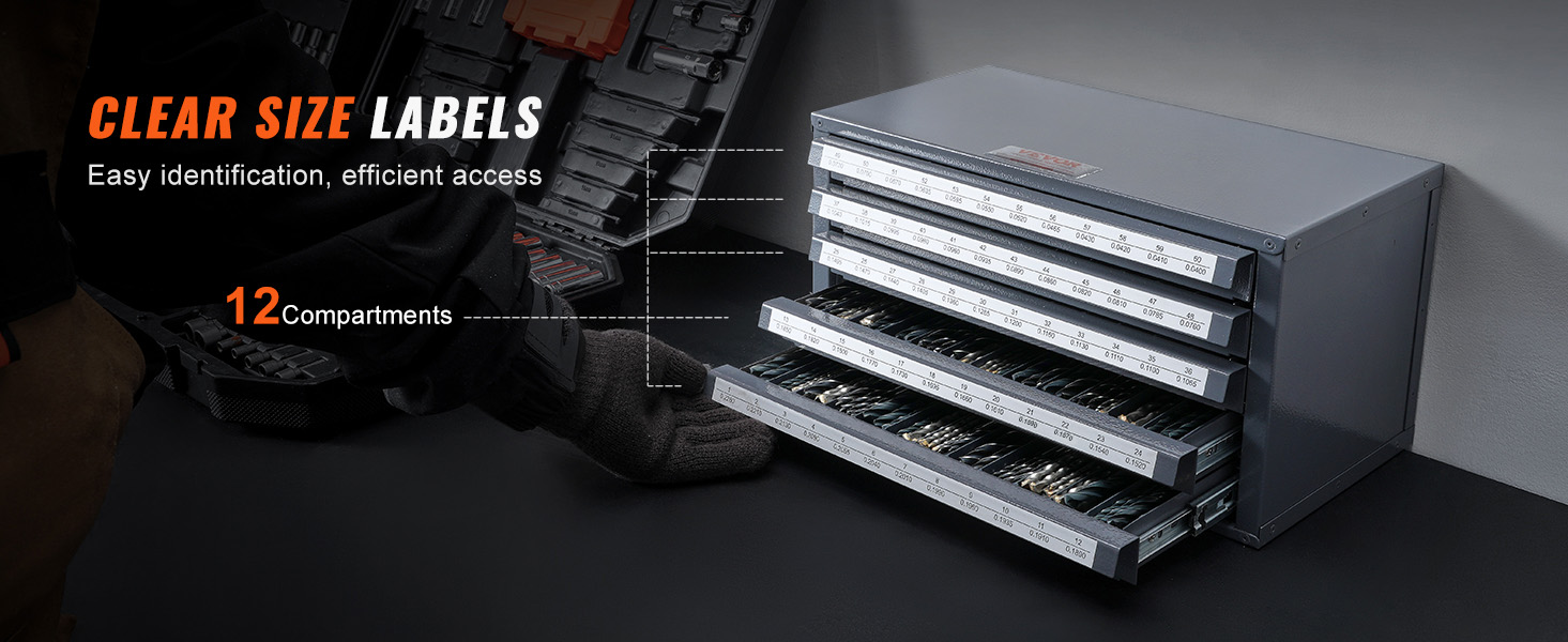 Viiden laatikon rakenne tarjoaa 60 erillistä lokeroa, jotka on mitoitettu poranterille koossa #1–#60. Jokainen lokero tarjoaa selkeän ja kiinteän paikan poranterälle tai pienille lisävarusteille, jolloin eri koot löytyvät nopeasti ja työskentely sujuu ilman etsimistä.