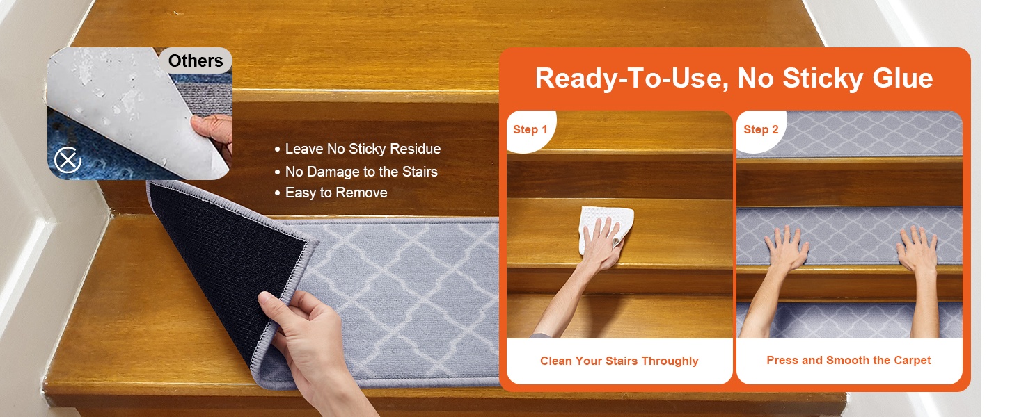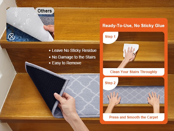 Asennus käy kahdessa vaiheessa: puhdista ensin askelmat ja aseta sen jälkeen matot haluamaasi paikkaan. Erillistä liimaa tai työkaluja ei tarvita.