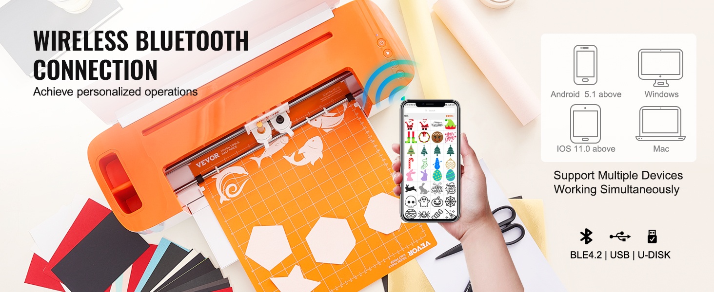 Leikkuriin voi yhdistää muutamassa vaiheessa Bluetoothin kautta, jolloin johdot eivät rajoita sijoittelua tai käyttöä. Laite tukee Mac-, Windows-, Android 5.1+- ja iOS 11.0+ -järjestelmiä, joten useampi laite voi olla yhdistettynä ja käytössä samanaikaisesti.