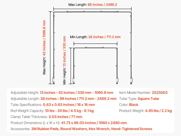 Pöytäkaariteline teräs neliöputki säädettävä pituus 71–249 cm korkeus 33–106 cm puristimilla