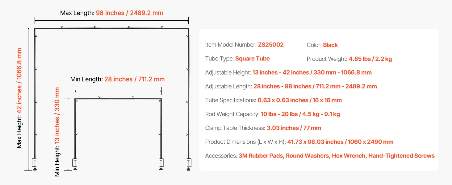 - Säädettävä pituus: 28–98 tuumaa / 711.2–2489.2 mm