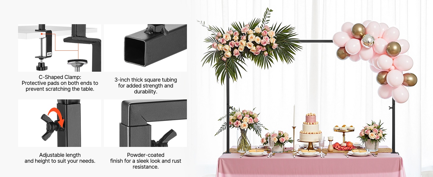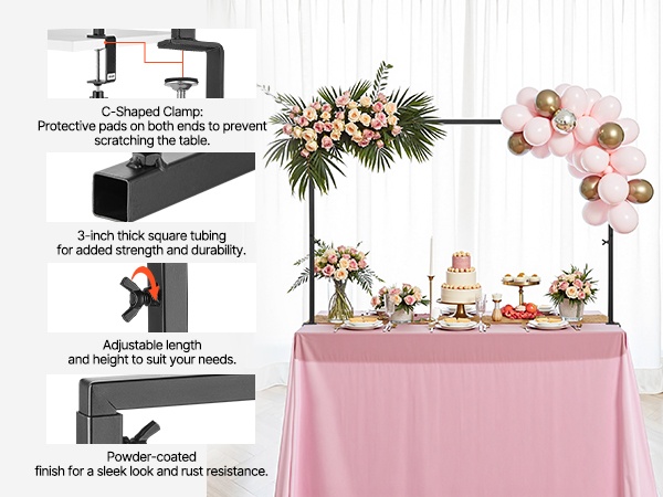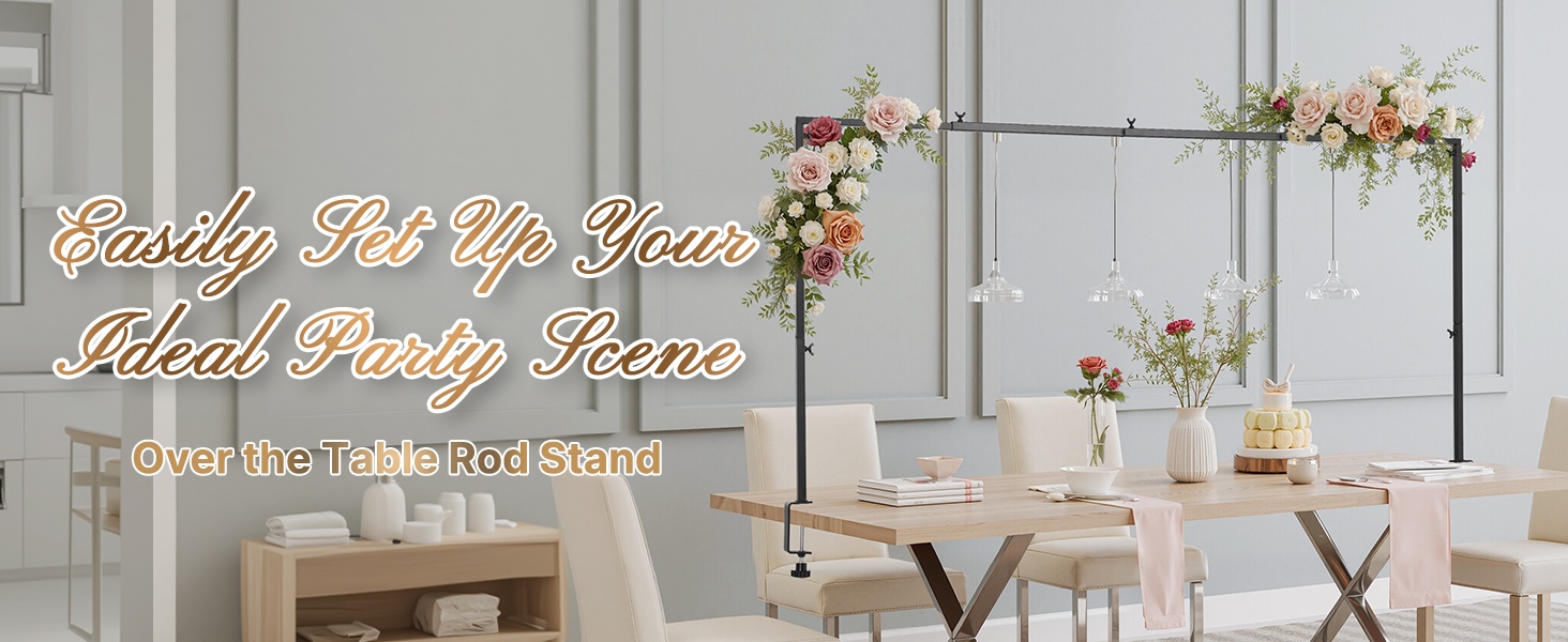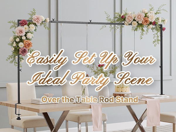 Tämä pöydän yläpuolelle kiinnitettävä tankoteline tukee koristeita yhteensä 10–20 paunaa (4.5–9.1 kg) ilman kaatumista. Kolmen säädettävän korkeuden ansiosta se sopii monen kokoisille pöydille ja toimii hyvin häissä, syntymäpäivillä, juhlapäivien kattauksissa ja muissa tilaisuuksissa. Mukana tulevat tarvikkeet ja säilytyslaukku helpottavat kuljetusta, säilytystä ja suojaavat osia.