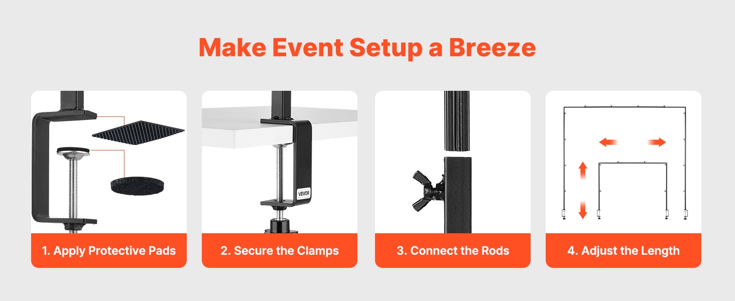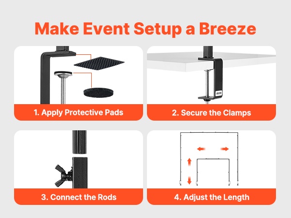 Asennus onnistuu neljässä yksinkertaisessa vaiheessa: kiinnitä suojatyynyt, kiristä puristimet pöydän reunaan, yhdistä tangot ja säädä pituus sopivaksi. Kokoaminen onnistuu noin 10 minuutissa. Selkeä rakenne tekee käytöstä helppoa myös aloittelevalle käyttäjälle.
