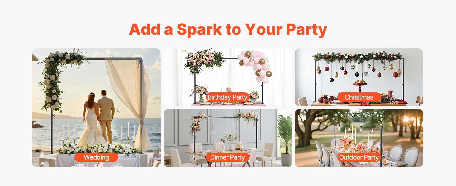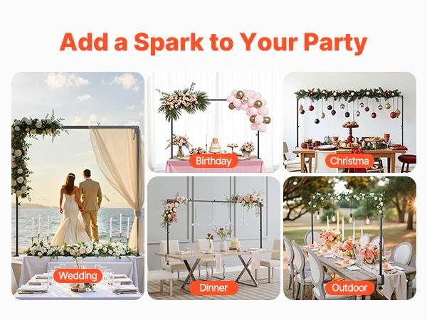 Tangolle voi ripustaa valosarjoja, tukea ilmapallo- ja kukkakaaria tai luoda kevyen katoksen ulkojuhliin. Se sopii häihin, juhlapäiviin, syntymäpäiviin ja muihin tilaisuuksiin, sekä sisä- että ulkokäyttöön, luoden näyttävän, mutta helposti muunneltavan koristelupohjan.
