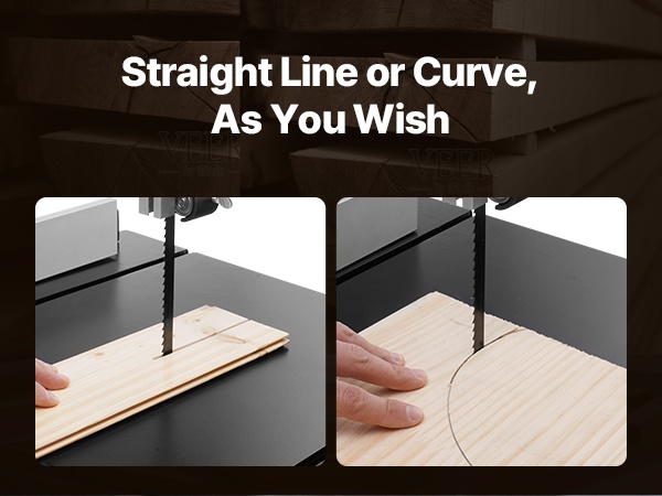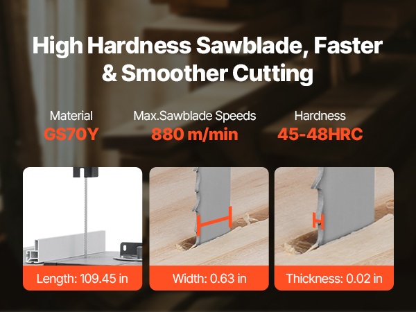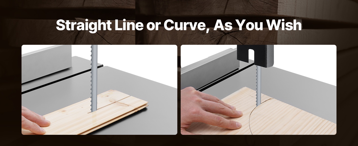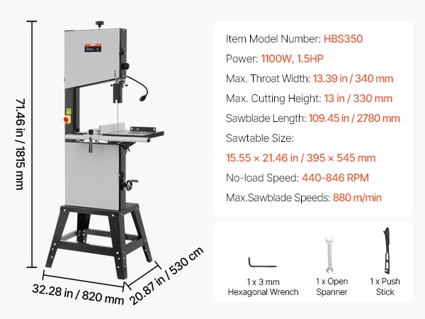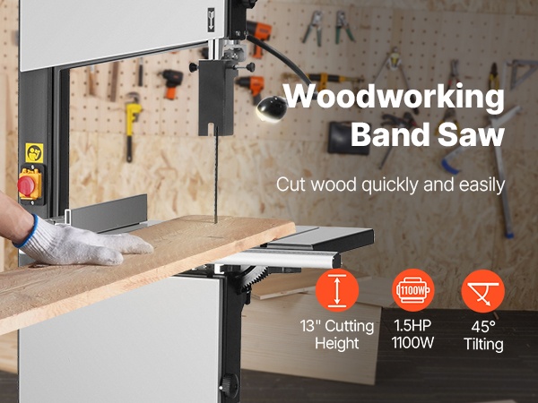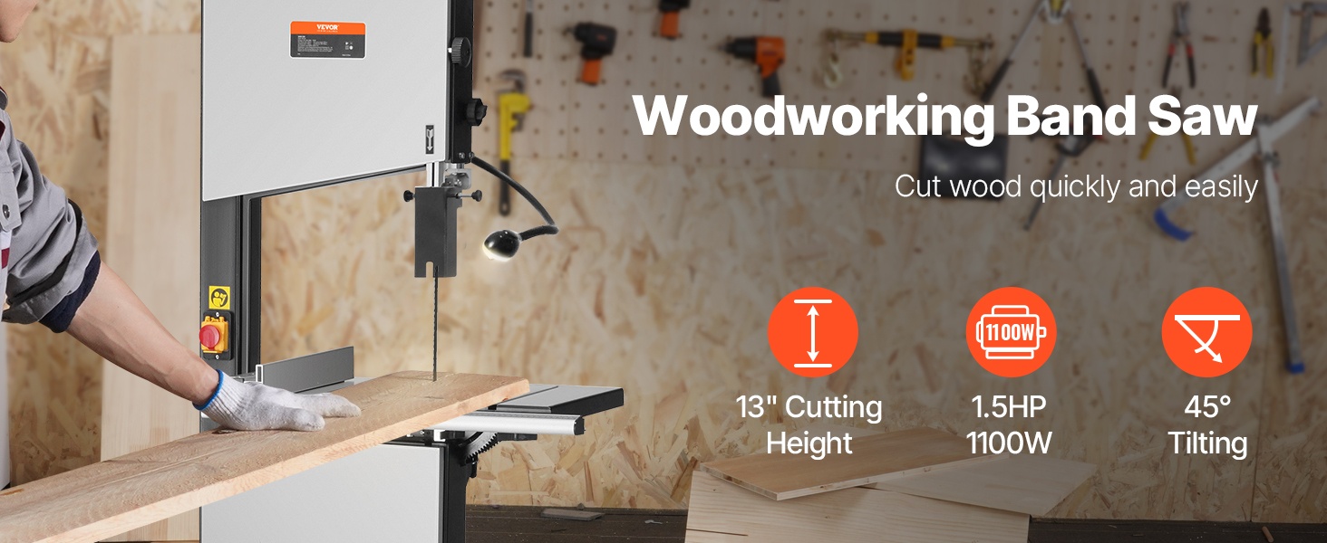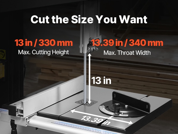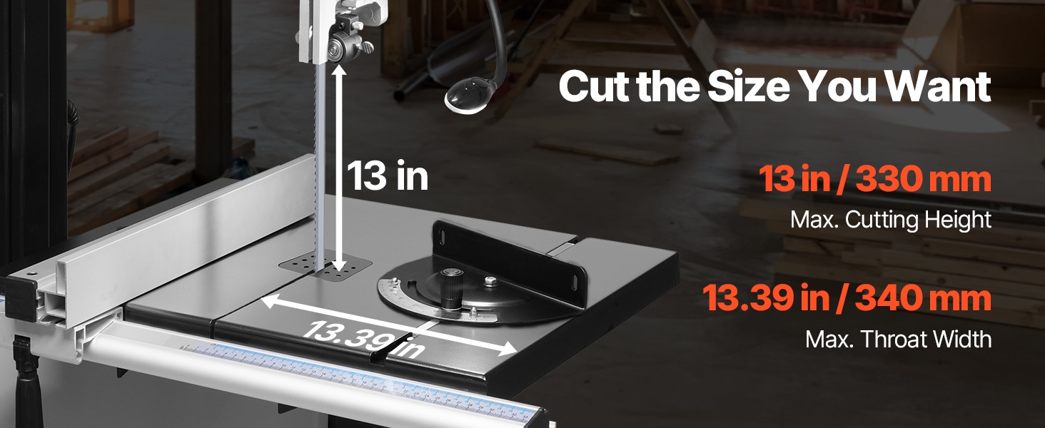 Pöytämallinen vannesaha jalustalla tarjoaa 13-tuumaisen (330 mm) maksimileikkauskorkeuden ja 13,39-tuumaisen (340 mm) leikkausleveyden. 1100W (1-1/2HP) moottori ja portaattomasti säädettävä 440–846 RPM -nopeus varmistavat tarkan ja tehokkaan sahauksen. Työvalon optimoitu sijainti parantaa näkyvyyttä leikkauksen aikana.