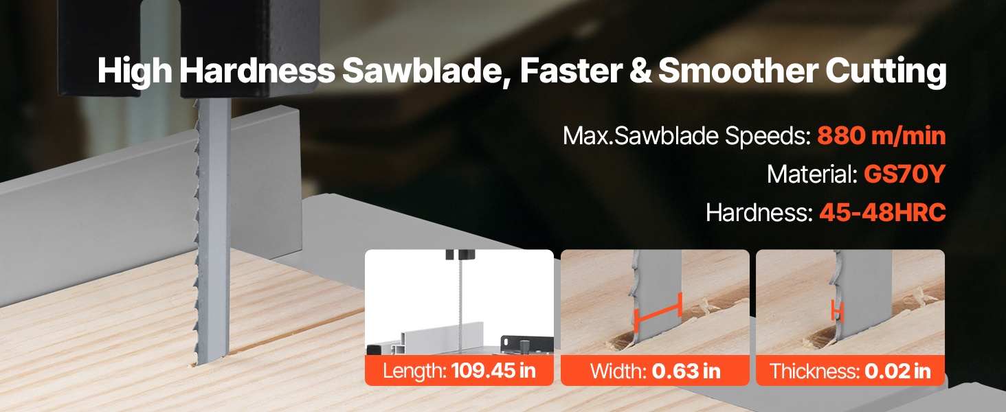 Terän enimmäisnopeus on 2887.5 ft/min (880 m/min). Terän mitat: pituus 109.45 in (2780 mm), leveys 13.39 in (340 mm), paksuus 0.0197 in (0.5 mm). GS70Y-materiaalista valmistettu, kovuudeltaan HRC 45–48 terä tarjoaa tasaisen ja tehokkaan leikkuujäljen puulle.