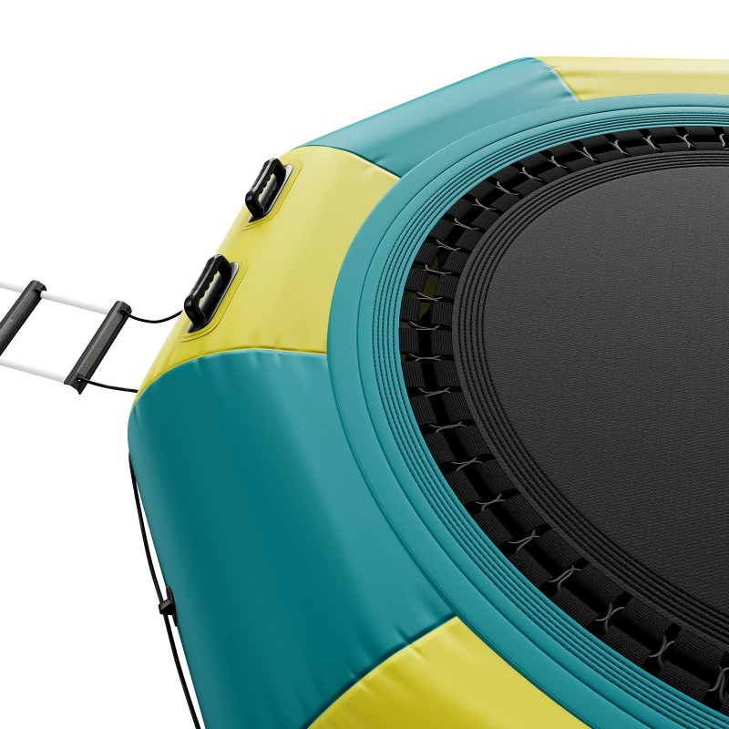 Trampoliini on valmistettu paksusta PVC-kankaasta, joka on vedenpitävä, kulutusta kestävä ja suunniteltu toistuvaan käyttöön vedessä. Joustavat köydet on ommeltu viidellä ommelkerroksella ja punottu tiiviisti, mikä lisää turvallisuutta ja ehkäisee jalkojen sotkeutumista. Lisäturvaa tuovat apuköydet, jotka ovat erityisen hyödyllisiä lasten käytössä.