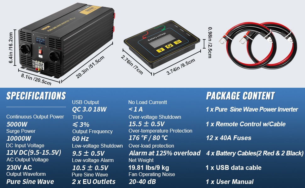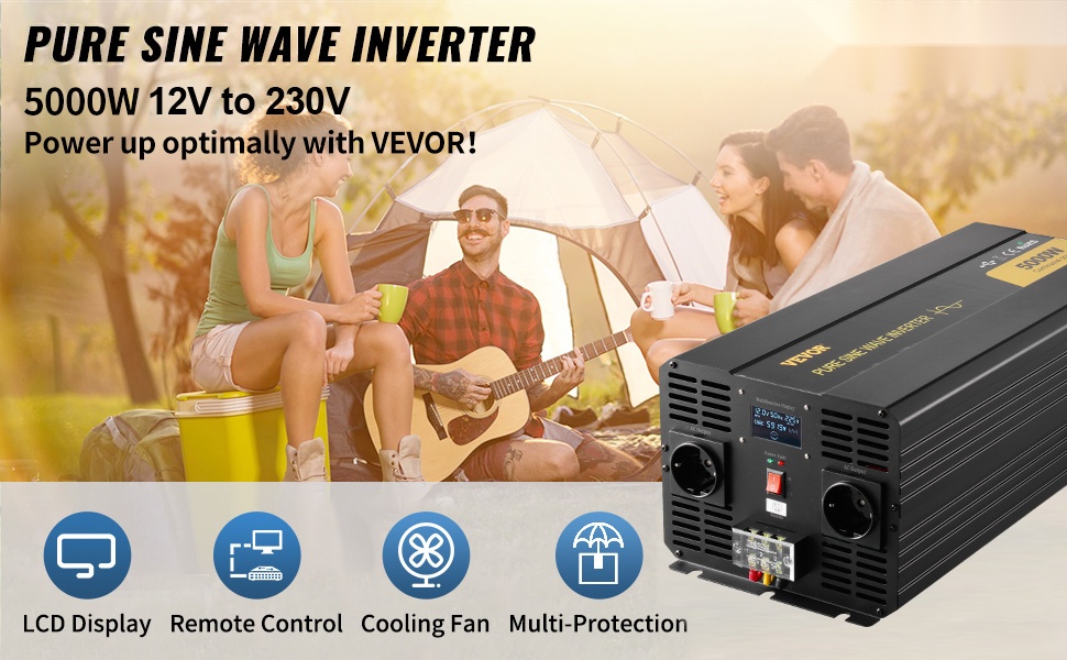 Tämä puhdas siniaaltoinvertteri muuntaa tasajännitteen DC 12V vaihtojännitteeksi AC 230V ja tuottaa jatkuvan, vakaan puhtaan siniaallon herkillekin sähkölaitteille. LCD-näyttö, älykäs jäähdytyspuhallin ja useat suojaustoiminnot helpottavat käyttöä ja auttavat pitämään laitteet turvassa. Sopii esimerkiksi kannettaville tietokoneille, tuulettimille, jääkaapeille, mikroaaltouuneille, muuntajilla varustetuille virtalähteille ja kahvinkeittimille autoissa, matkailuajoneuvoissa, kuorma-autoissa ja aurinkosähköjärjestelmissä.