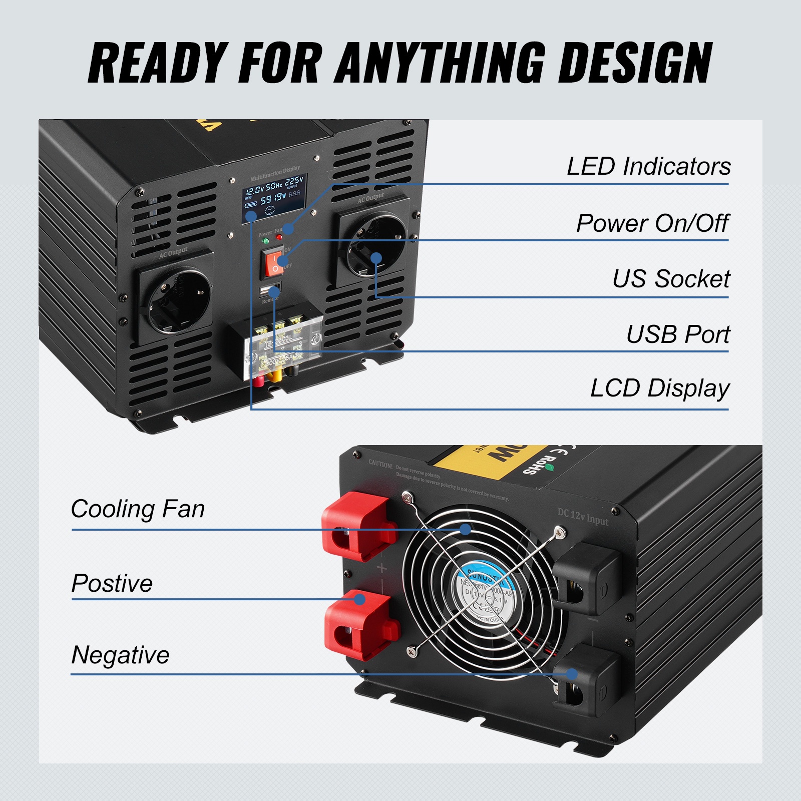 Selkeä rakenne ja käyttöliittymä helpottavat invertterin käyttöä. Kun sisälämpötila saavuttaa 113 ℉ / 45 ℃, jäähdytyspuhallin käynnistyy automaattisesti lämpötilan alentamiseksi. Alumiiniseoskuori kestää hyvin hapettumista ja muodonmuutoksia.