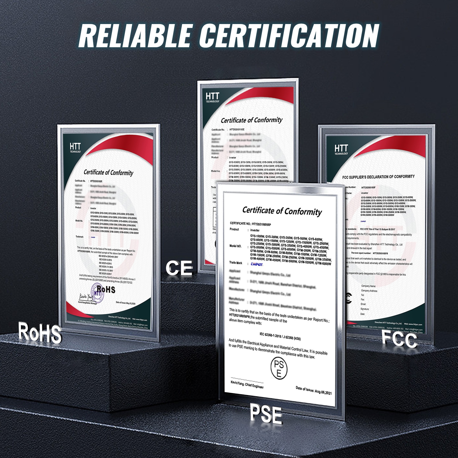 Puhdas siniaaltoinvertteri täyttää CE-, FCC-, RoHS- ja PSE-vaatimukset. Kuusi pääsuojatoimintoa parantavat käyttöturvallisuutta ja auttavat sähkölaitteita toimimaan vakaasti.