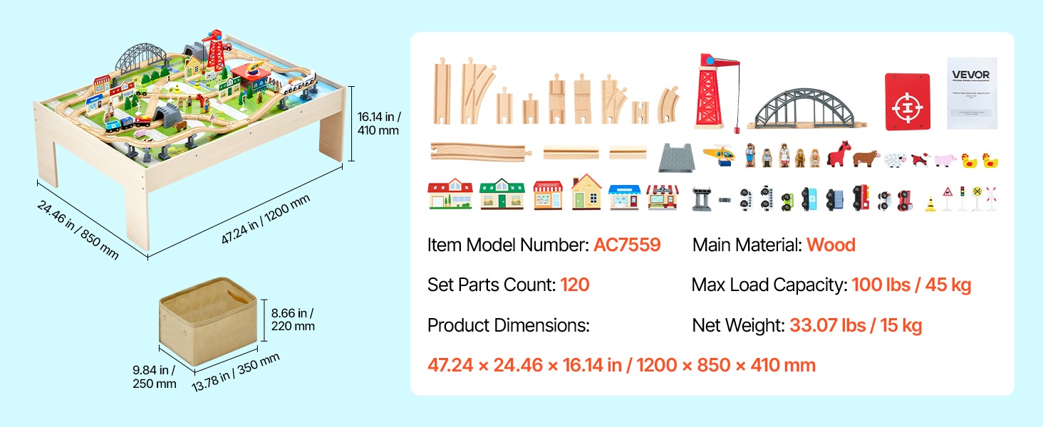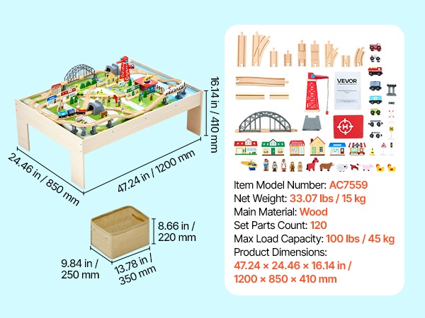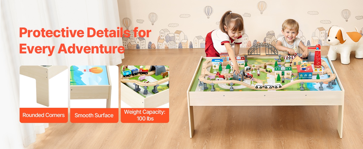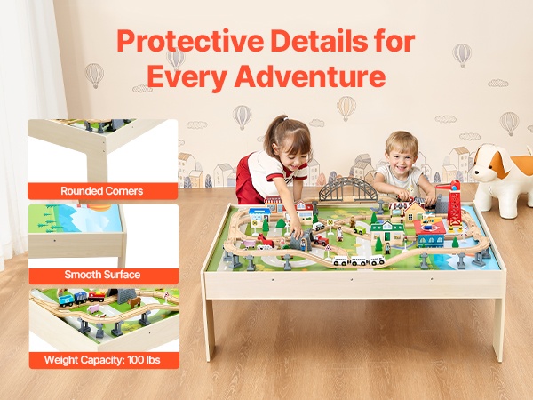 Junaratapöydässä on pyöristetyt kulmat kolhujen vähentämiseksi sekä sileä, purseeton pinta naarmujen välttämiseksi. Enimmäiskuormitus on 100 lbs / 45 kg, joten pöytä kestää hyvin lasten leikit ja tuo mielenrauhaa vanhemmille.