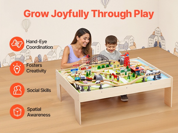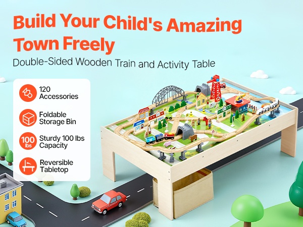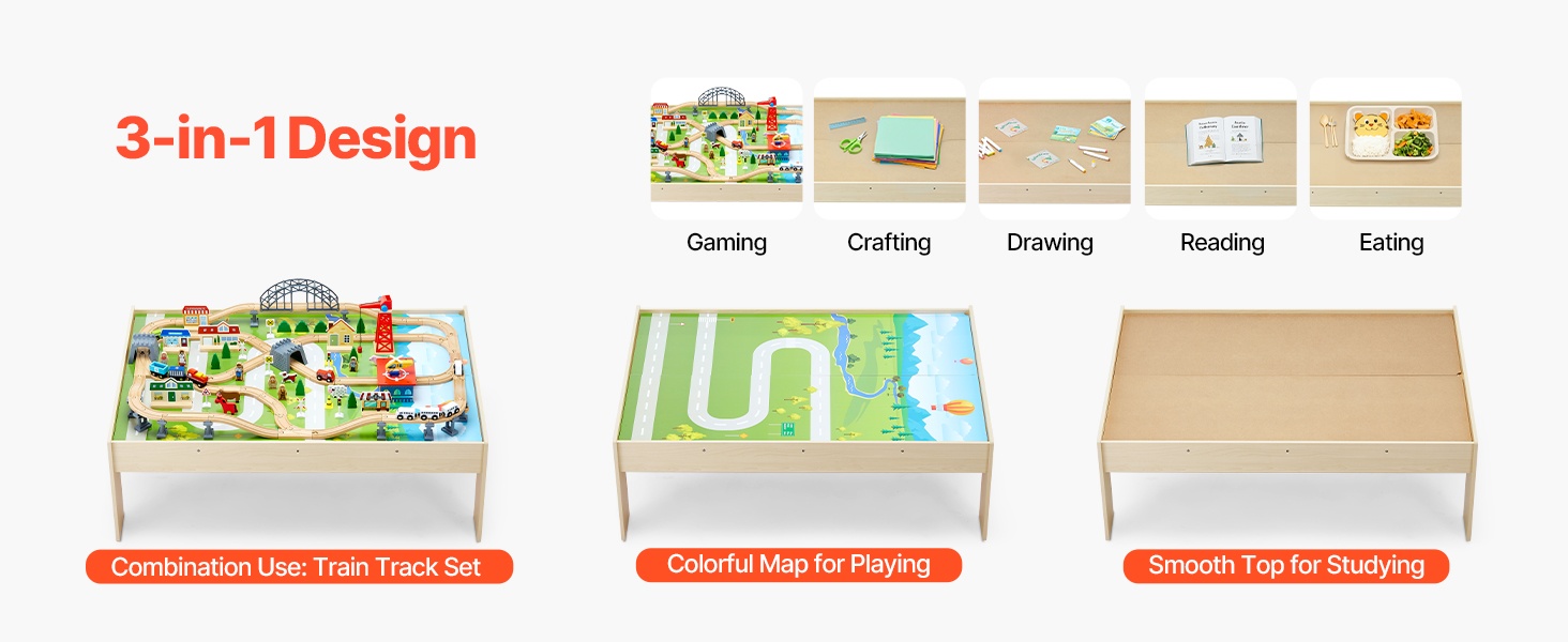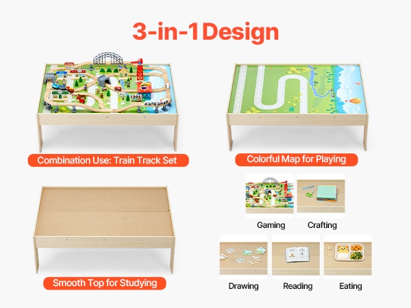 - 3-in-1 puinen junarata- ja aktiviteettipöytä leikkiin, piirtämiseen, lukemiseen ja syömiseen