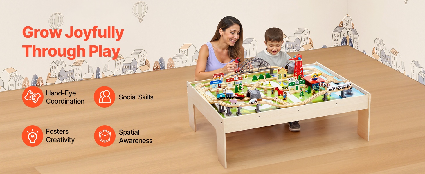 Lasten junaratapöytään sisältyy tarvikkeita arjen tilanteiden jäljittelemiseen, kuten lastaamiseen ja kuljetukseen junilla ja helikoptereilla. Useat eri leikkialueet kannustavat yhteisleikkiin ja tukevat lasten sosiaalisten taitojen ja vuorovaikutuksen kehittymistä.