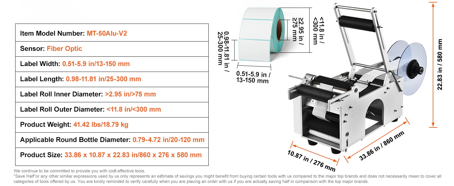 Runko on valmistettu alumiiniseoksesta, mikä tekee laitteesta kestävän mutta kohtuullisen painoisen. Rullamateriaali on PA6-muovia. Mitat ovat noin 33.86 x 10.87 x 22.83 in / 860 x 276 x 580 mm ja paino 41.42 lbs / 18.79 kg. Laite käyttää kuituoptista sensoria ja ruuvi-tyyppisiä säätöjä. Se sopii itseliimautuville etiketeille, joiden leveys on 0.51–5.9 in / 13–150 mm ja pituus 0.98–11.81 in / 25–300 mm. Mallinumero: MT-50Alu-V1.
