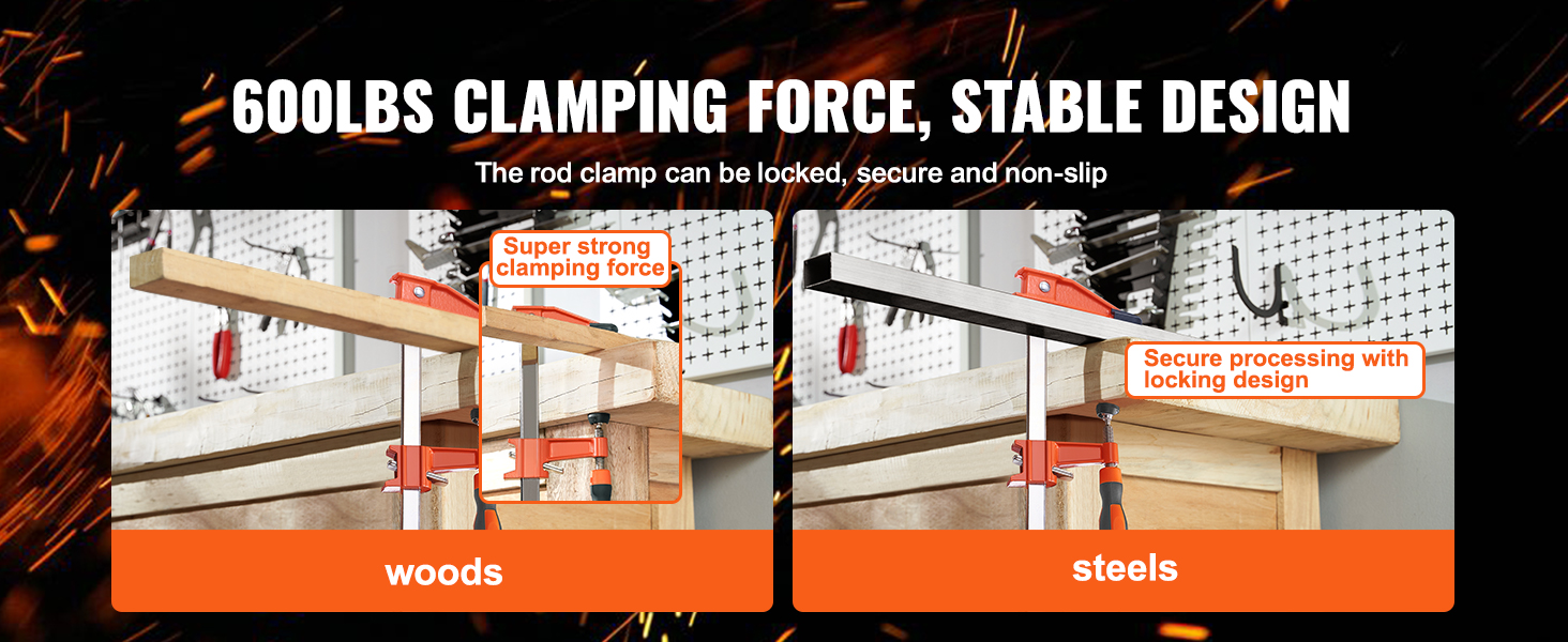 Suuri puristusvoima, jopa 600 lbs, helpottaa erilaisten puu- ja metalliosien kiinnittämistä. Puristimia voi käyttää esimerkiksi pöytien, tuolien ja kaappien kokoamiseen sekä teräskappaleiden pitävään kiinnitykseen.