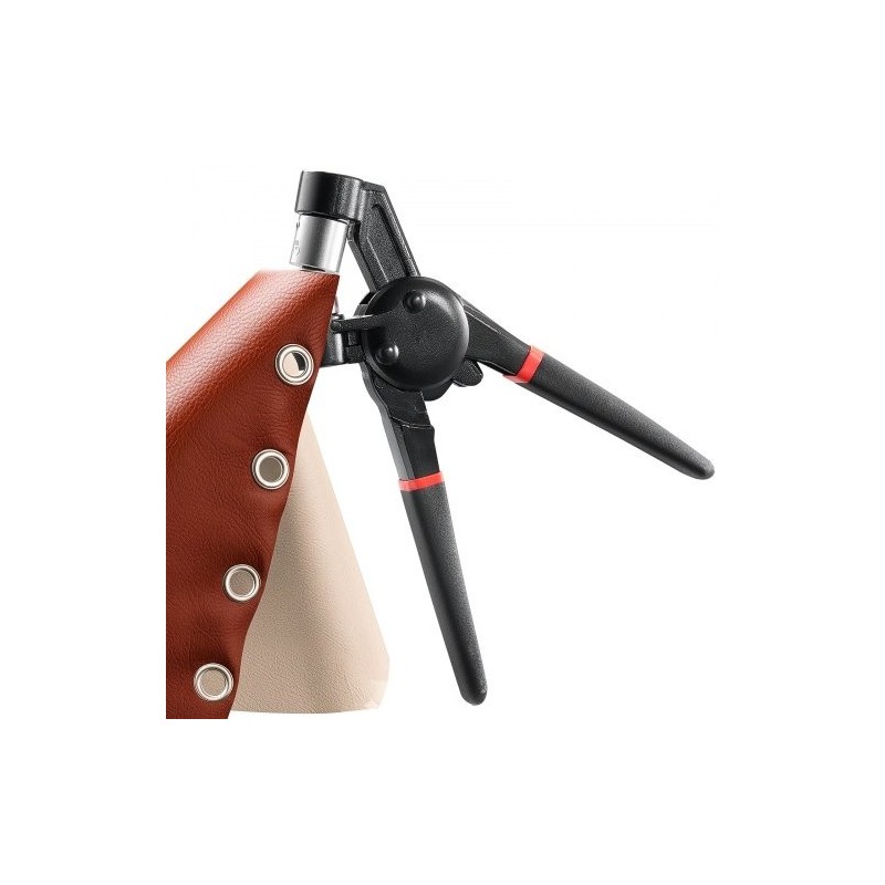 Asenna purjerenkaat asettamalla ensin materiaali ja purjerengas stanssille, jonka jälkeen puristat pihtejä tasaisen voiman avulla. Magneettinen stanssipää vetää purjerenkaan paikoilleen, mikä helpottaa kohdistusta etenkin ensimmäisillä kerroilla. Vaihda stanssin koko kääntämällä stanssia myötäpäivään irrottamista ja vastapäivään kiinnittämistä varten.