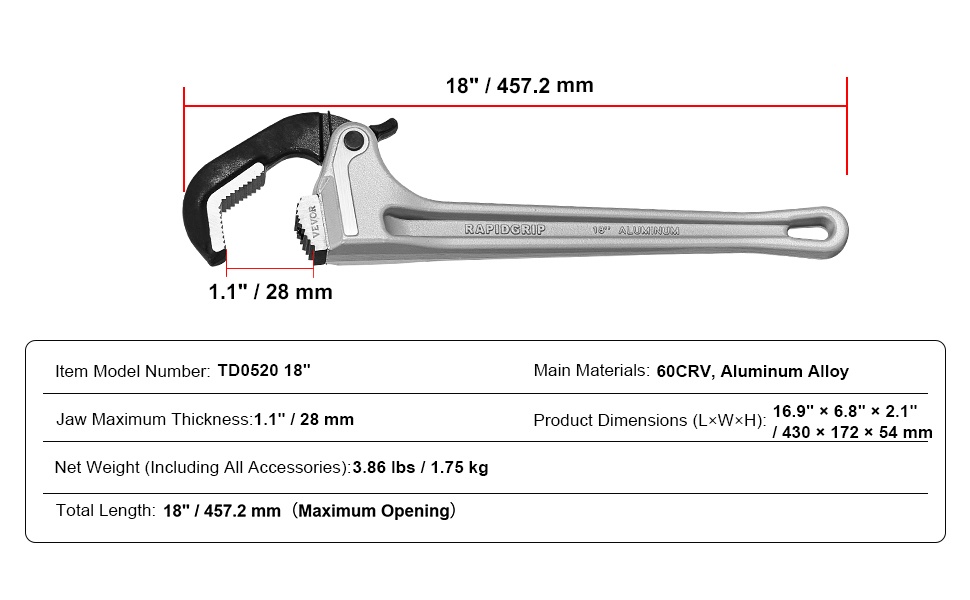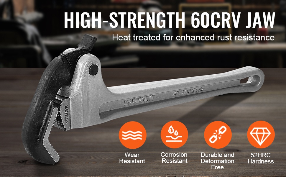 - Alumiinirunko – noin 40 % kevyempi kuin teräksinen putkiavain, helppo kantaa ja käyttää pitkään