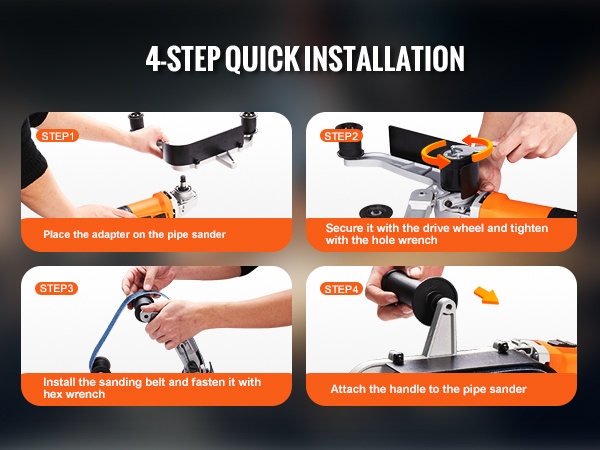 Kompakti ja kevyt laite on suunniteltu vaivattomaan käyttöön. Nelivaiheinen asennusprosessi on nopea: sovittimen paikalleen asettaminen, vetopyörällä kiinnittäminen ja kiristäminen, hiomanauhan asennus sekä kahvan kiinnitys. Näin pääset aloittamaan työt muutamassa minuutissa.