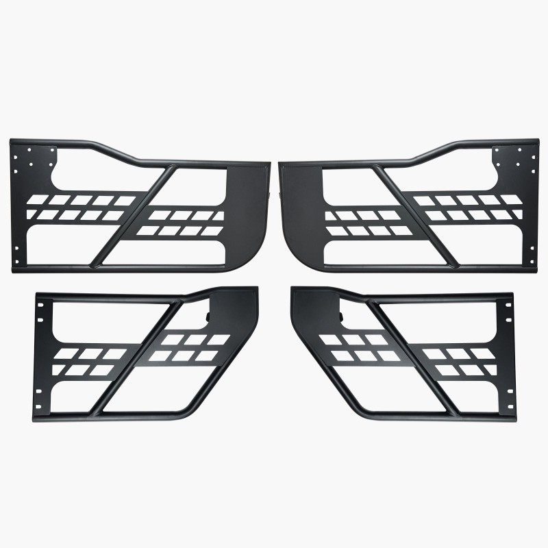 Nelikuiset putkiovet Jeep Wrangler JK -malliin vuosimalleille 2007–2018. Avonainen, metsästykseen ja maastoajoon sopiva putkirakenne parantaa näkyvyyttä ja ilmanvaihtoa, samalla kun teräsputki ja tukevat saranat tuovat lisäsuojaa verrattuna täysin avoimeen ajoon.