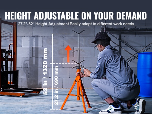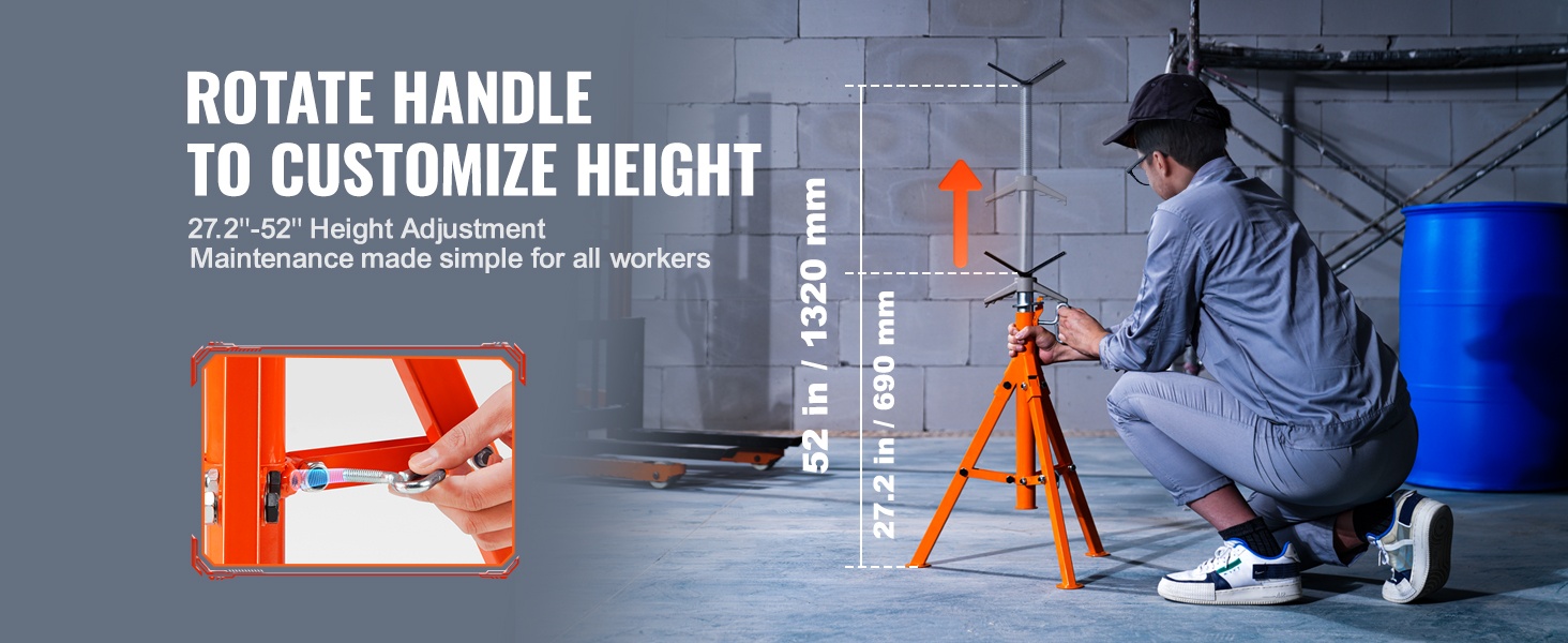 Telineen korkeutta voidaan säätää välillä 27.2–52 tuumaa yksinkertaisesti kääntämällä kahvaa. Kun sopiva korkeus on saavutettu, se lukitaan nopeasti aluslevyllä ja kiristettävällä ruuvilla. Näin putket saadaan tuettua juuri oikealle työskentelykorkeudelle.