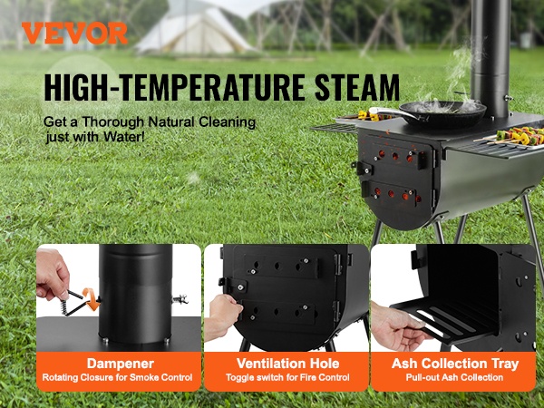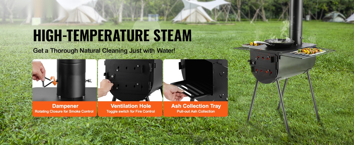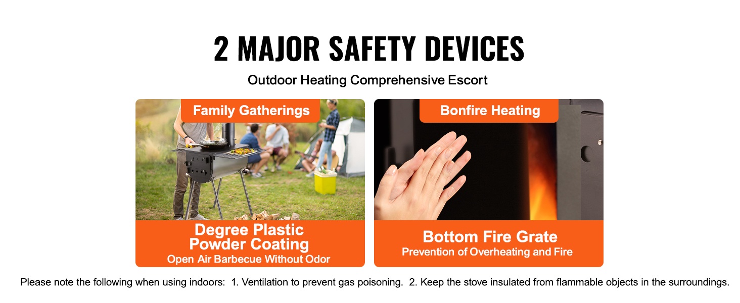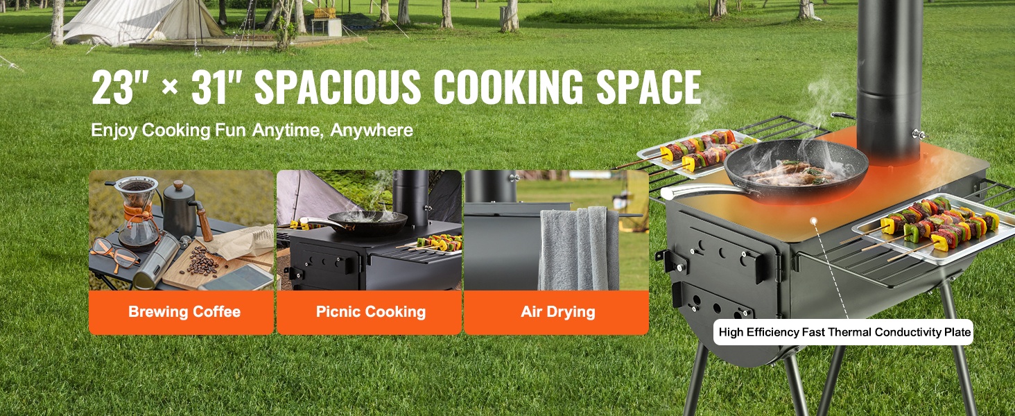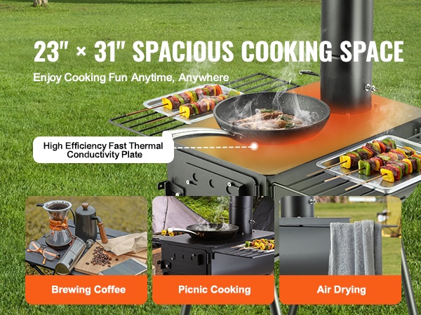 Suuren kapasiteetin tulipesä (640in³) tuottaa runsaasti lämpöä lämmitykseen ja ruoanlaittoon. Savupelti ja ilmanvaihtoaukot helpottavat vedon, liekkien ja savun säätöä. Kamiinan päällä olevat 353 x 473 mm / 14" x 17" hyllyt soveltuvat vaatteiden kuivatukseen, ruoan valmistukseen ja veden keittämiseen, jolloin tilankäyttö ulkona tehostuu.
