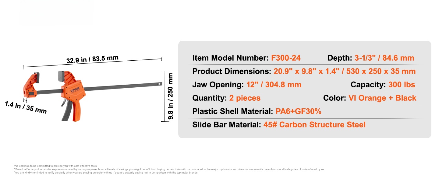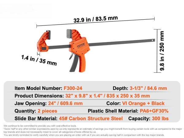 Puupuristimet ja levittimet 2 kpl, F300-24, hiiliteräs ja vahvistettu muovi, 300 lbs puristusvoima
