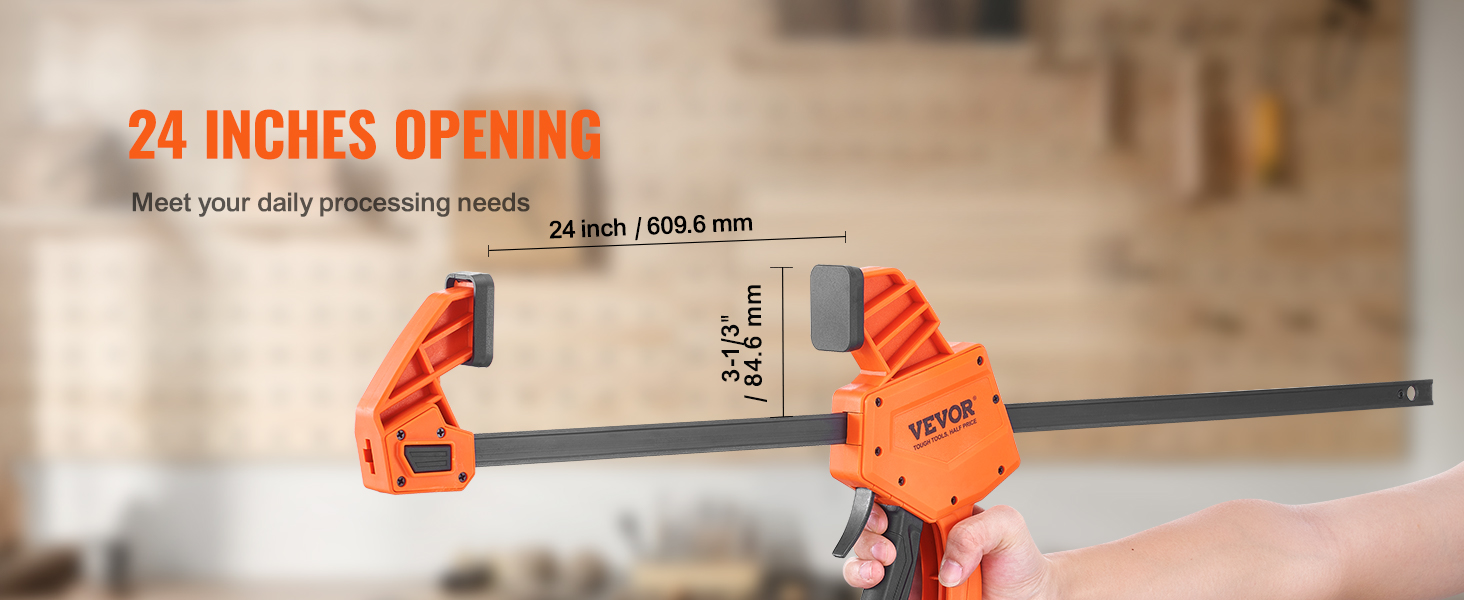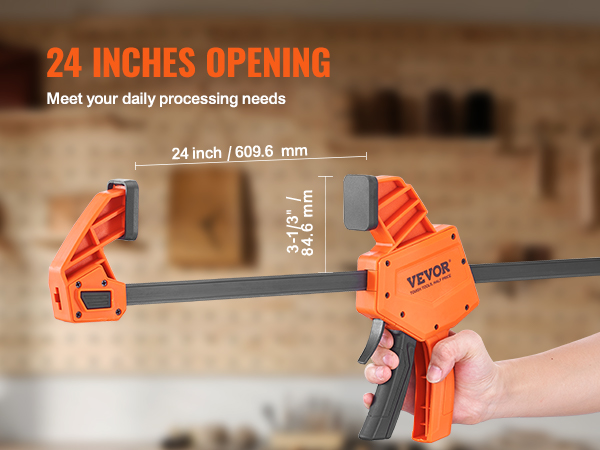 Yhden käden käytettävät puristimet ja levittäjät sopivat monipuoliseen puu- ja metallityöhön. Korkealujuuksinen muovirunko ja hiiliteräksinen liukukisko takaavat vankan otteen ja pitkän käyttöiän. Pakkaus sisältää 2 kappaletta puristimia, joissa on 24-tuumainen leuka-avauma ja enintään 300 lbs puristusvoima.