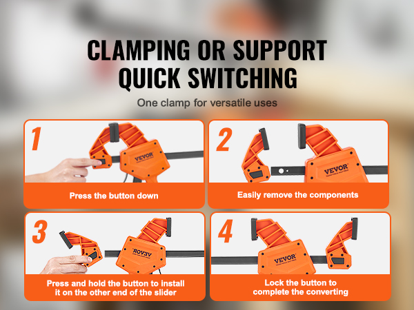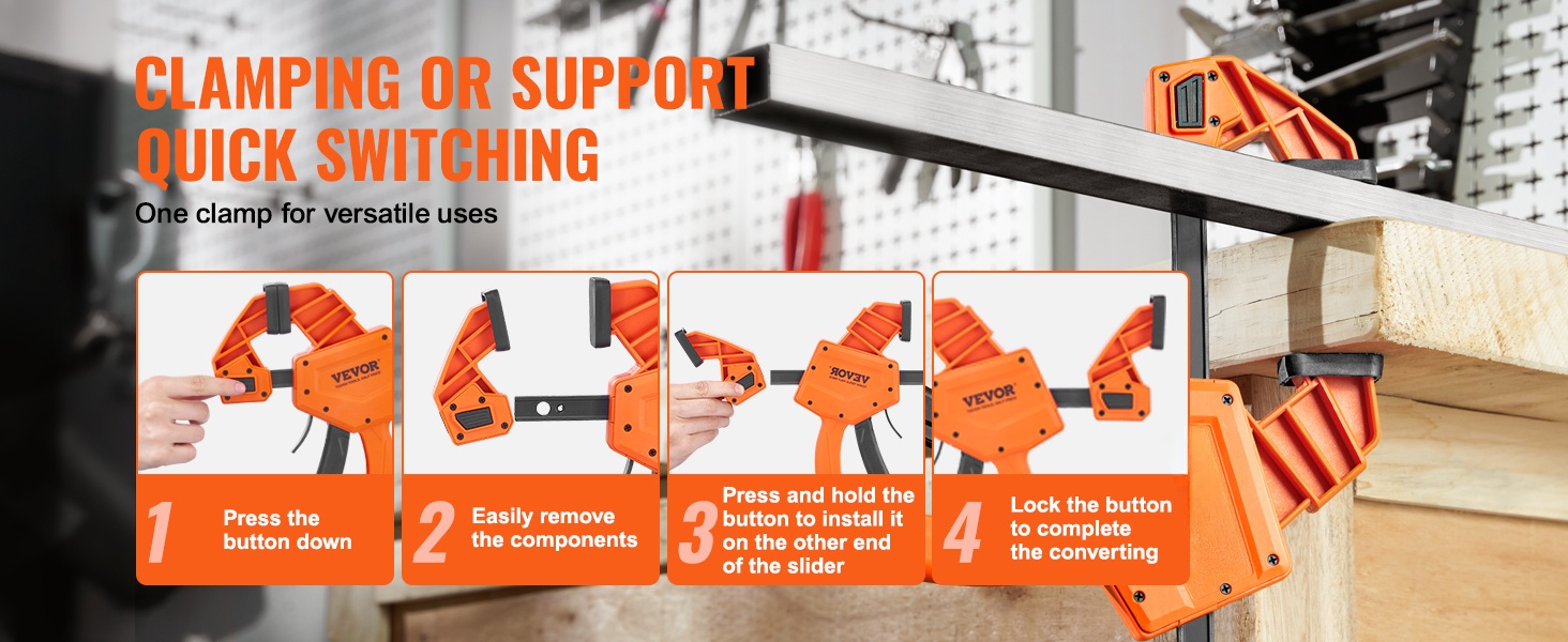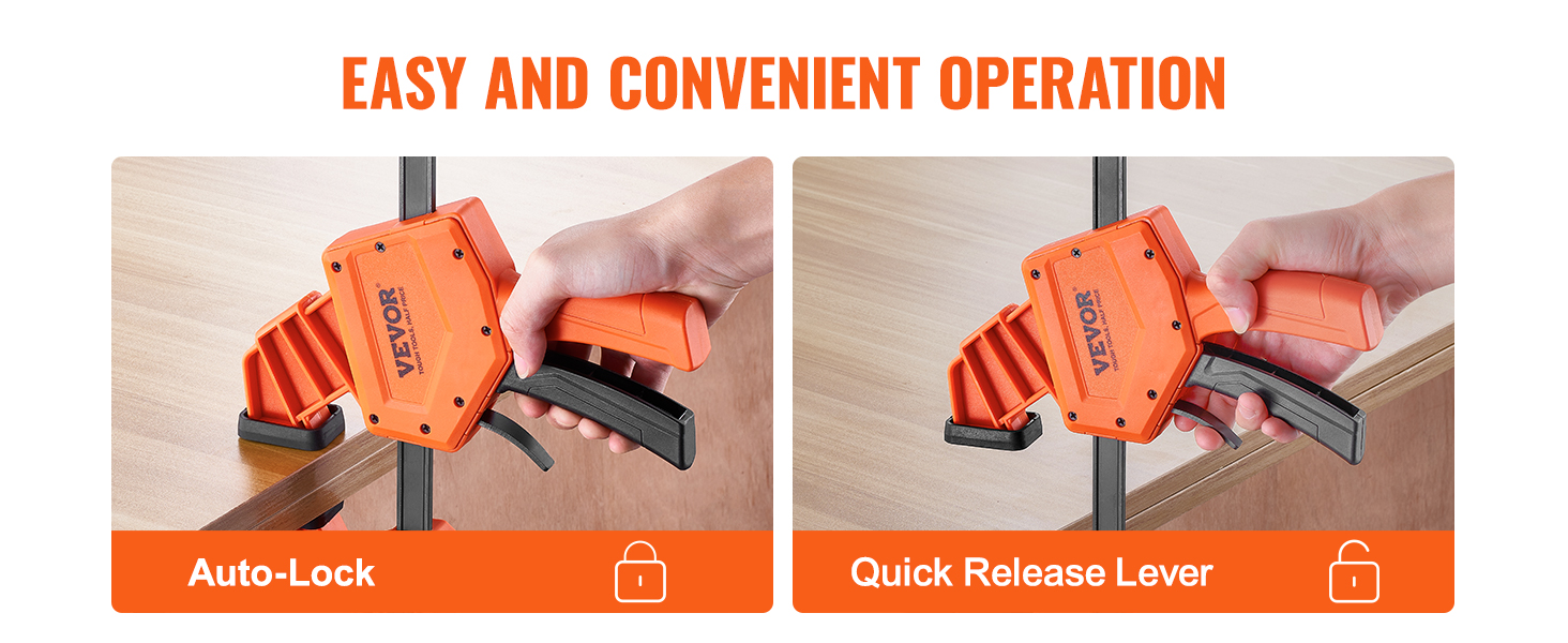 Vahvan, enintään 300 lbs puristusvoiman ansiosta puristimilla voi kiinnittää, katkaista, liittää ja asentaa erilaisia puutuotteita, kuten pöytiä, tuoleja ja kaappeja, sekä myös teräksisiä työkappaleita.