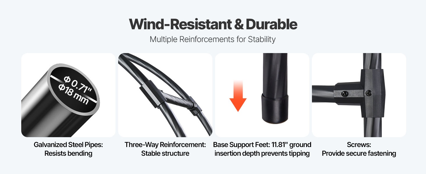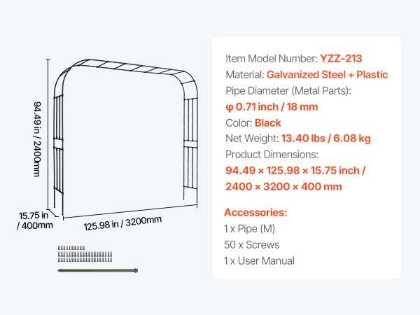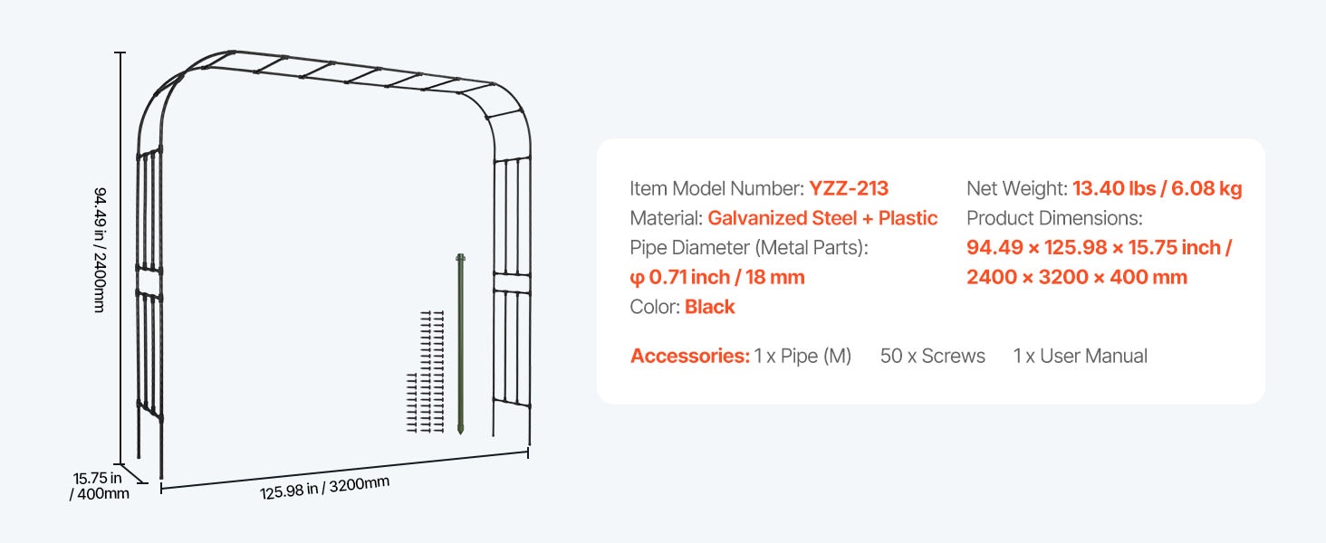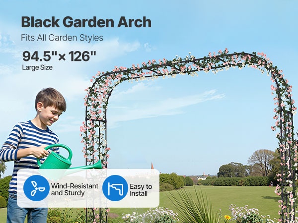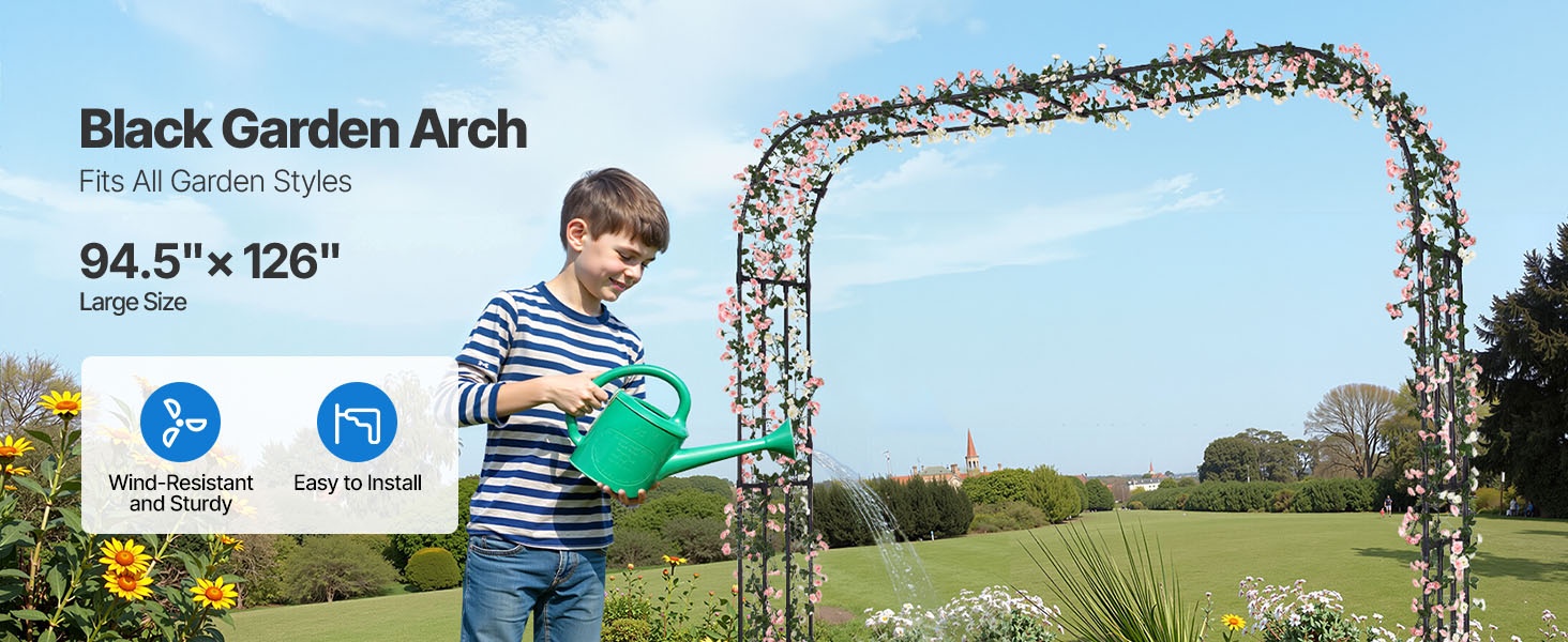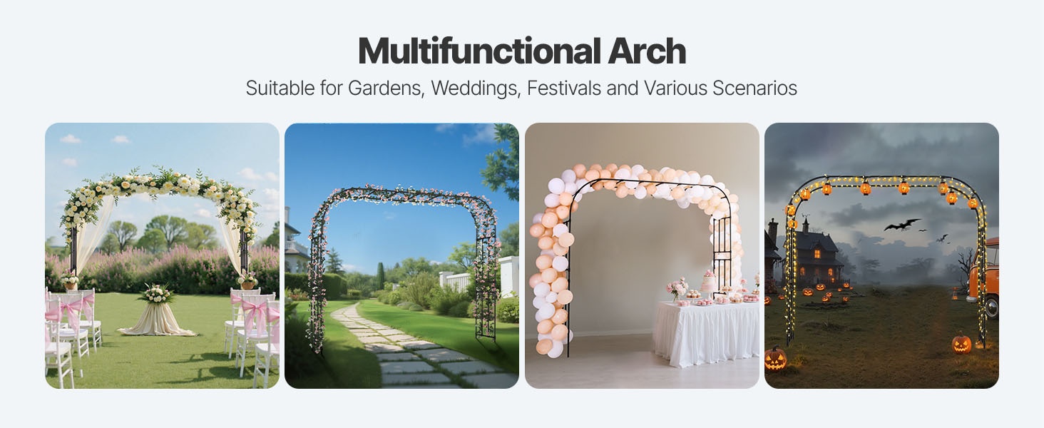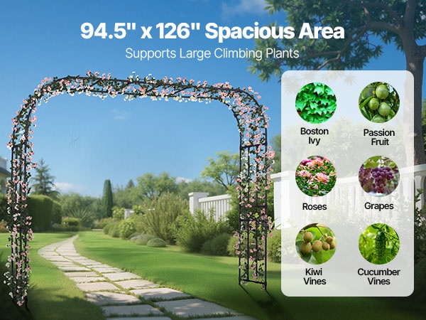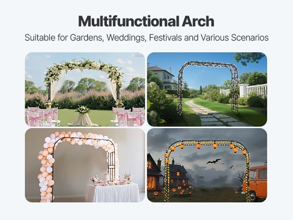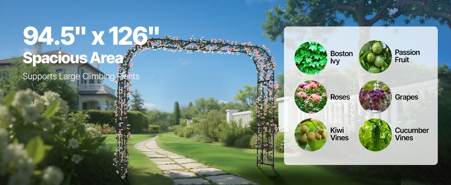 Tämä metallinen puutarhakaari viimeistelee pihan ilmeen ja sopii monenlaisiin puutarhatyyleihin. Sinkityistä teräsputkista valmistettu kaari on vahvistettu T-liittimillä paremman tuulenkestävyyden takaamiseksi. Koko 94.49 × 125.98 tuumaa (noin 2400 × 3200 mm) tarjoaa runsaasti tilaa köynnöskasveille sekä häiden, juhlien ja muiden tilaisuuksien koristeluun.